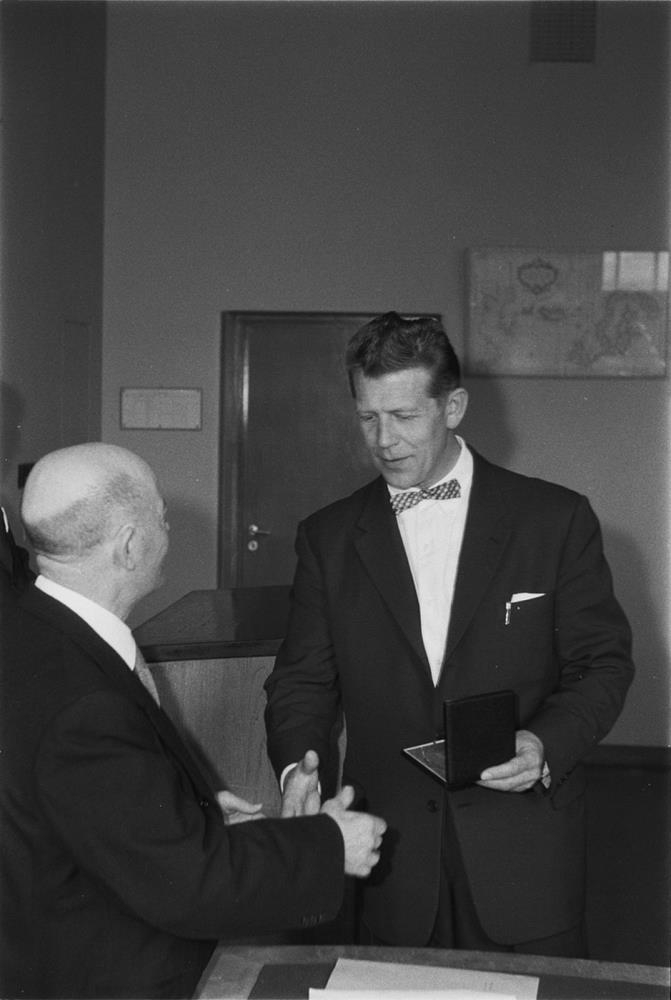 Verðlaun afhent úr Minningarsjóði Daða Hjörvar, fyrir fegurstan flutning íslensks máls í útvarpi, 11. júní 1961.