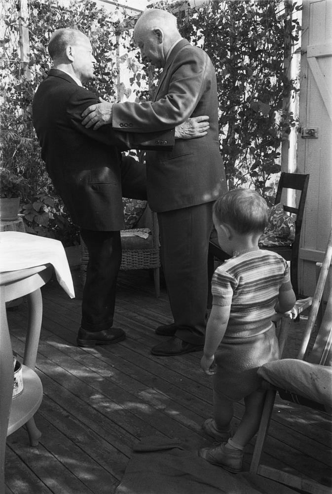 Emil Tómasson og Helgi Hjörvar sýna hvor öðrum glímubrögð, afastrákur Emils, Emil Tómasson fylgist með.