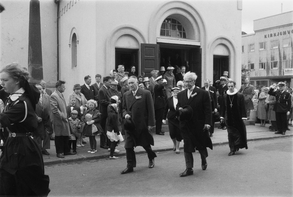 Fólk að koma úr Dómkirkjunni.
