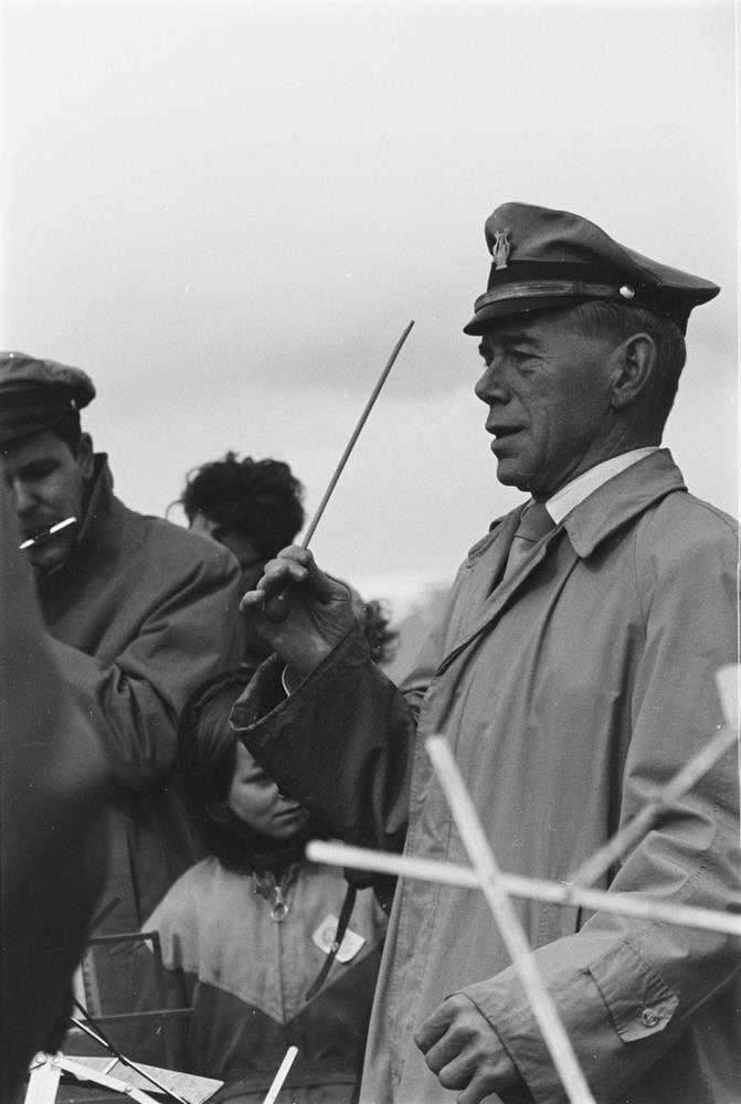 Hljómsveitarstjóri að stjórna lúðrasveit.