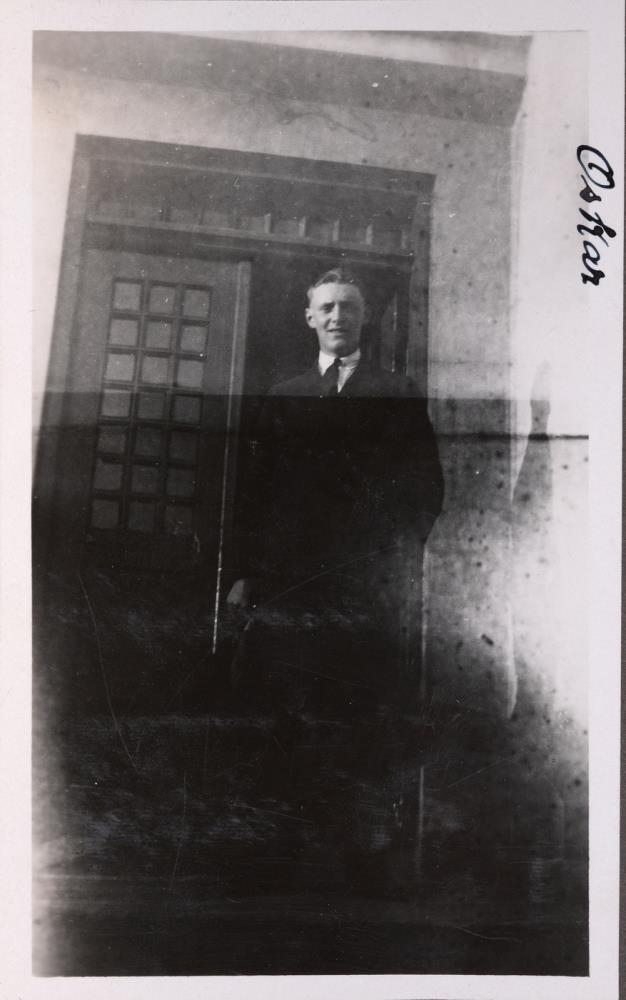 Ungur karlmaður stendur við húsdyr. Á mynd er skrifað: Óskar.