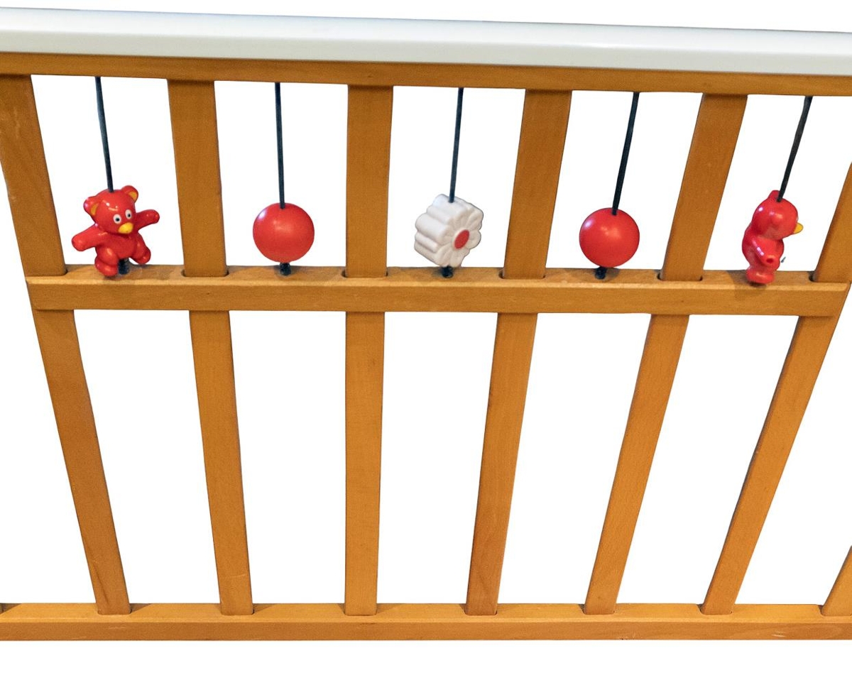 Barnarúm úr ljósum við með hvítum plötum með bangsamynd og kanínumynd