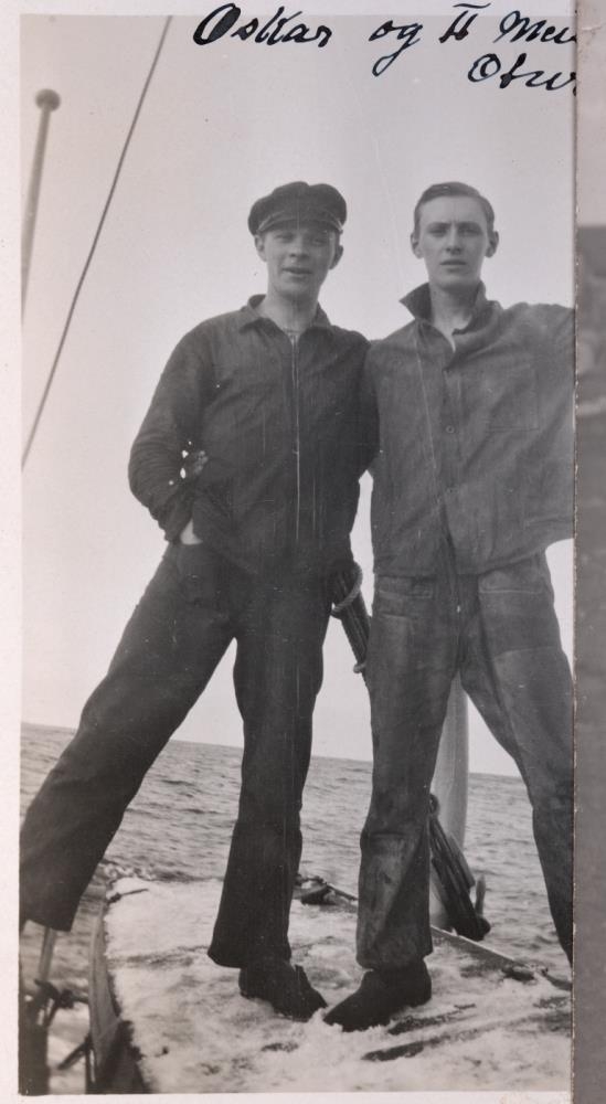 Tveir ungir karlmenn um borð í skipi. Líklega Lúðvík Magnússon t.v. Á myndina er skrifað: Oskar og II. Meistari. Otur.