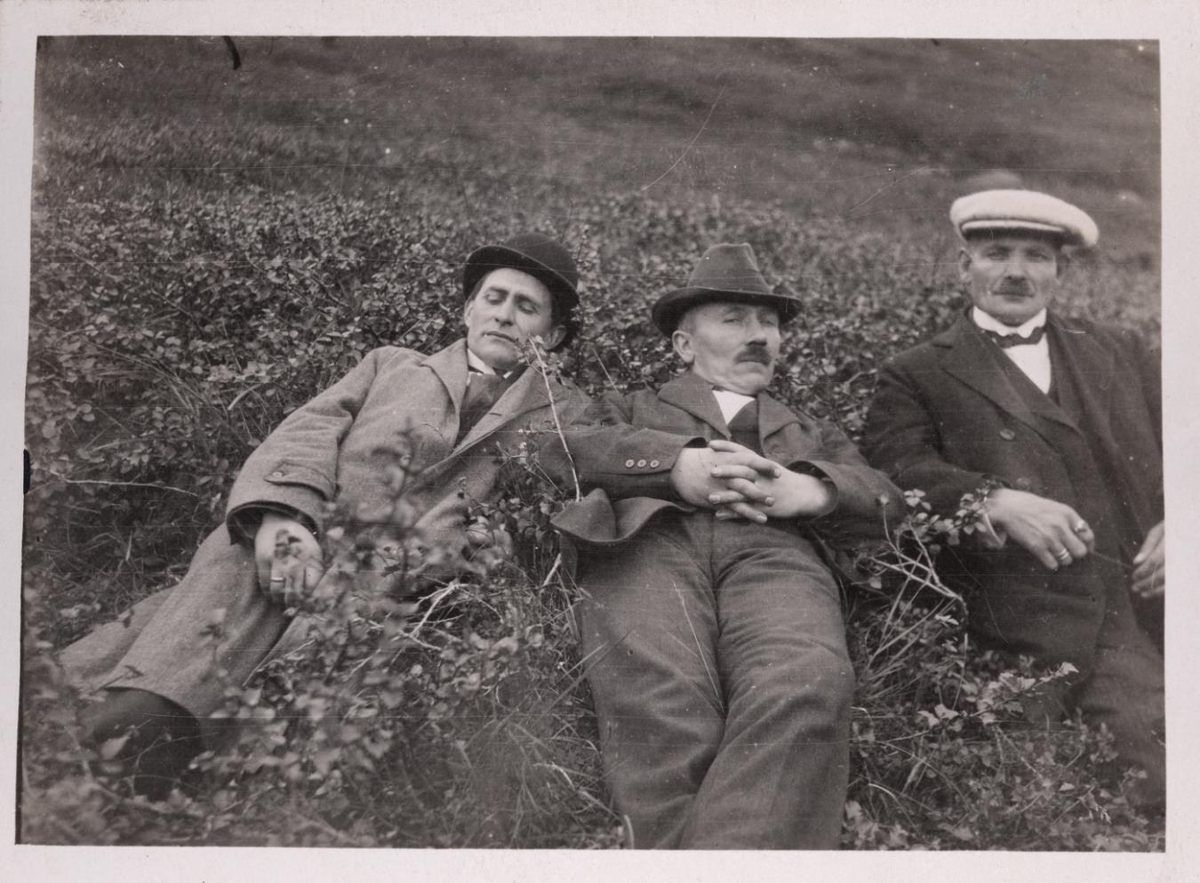 Þrír karlmenn hvílast í lyngbrekku. Magnús Magnússon kaupmaður í miðið.