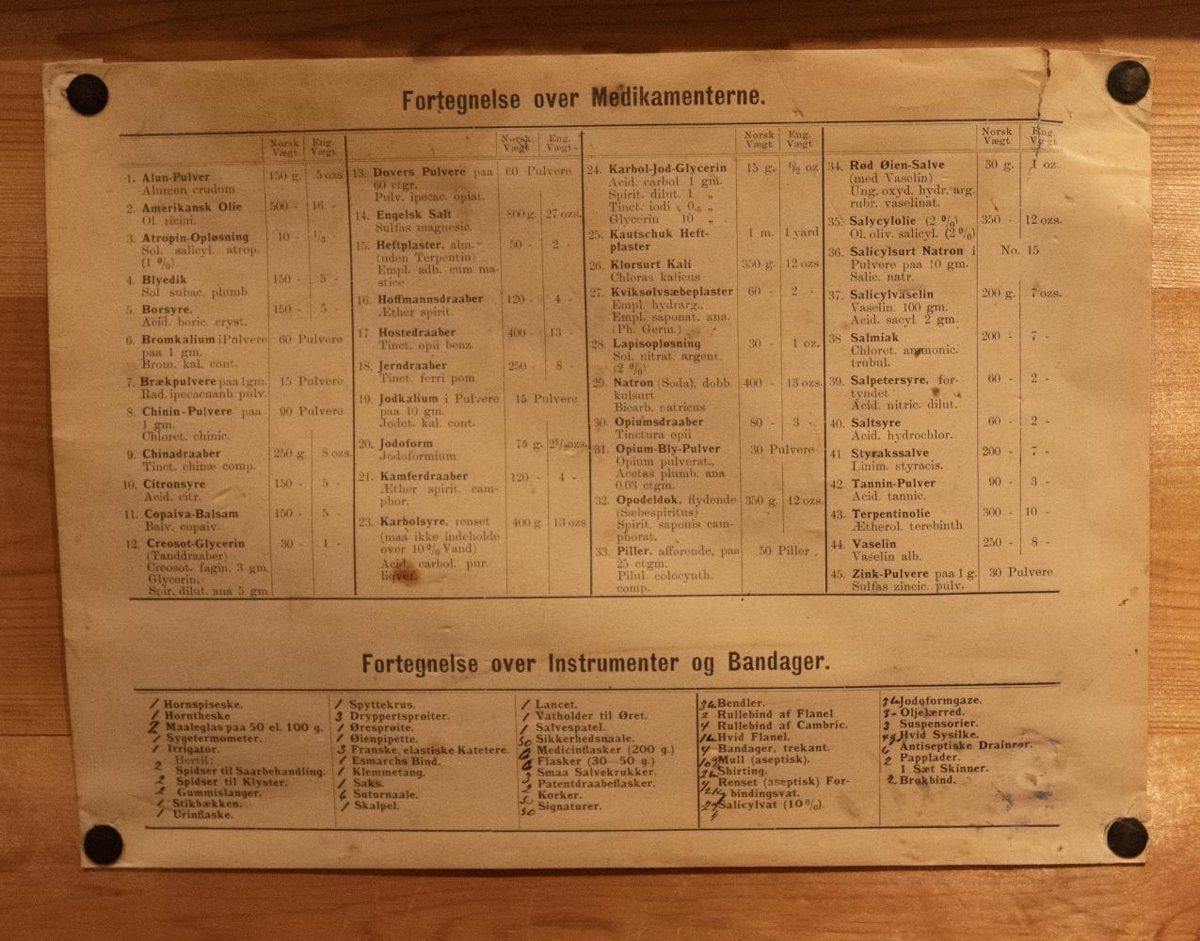 Efst er hólfað niður og innihalda lyfjaglös, grisjur o.fl. Einnig er fest með teiknibólum innan á lok leiðbeiningar sem hafa líklega fylgt kistunni.