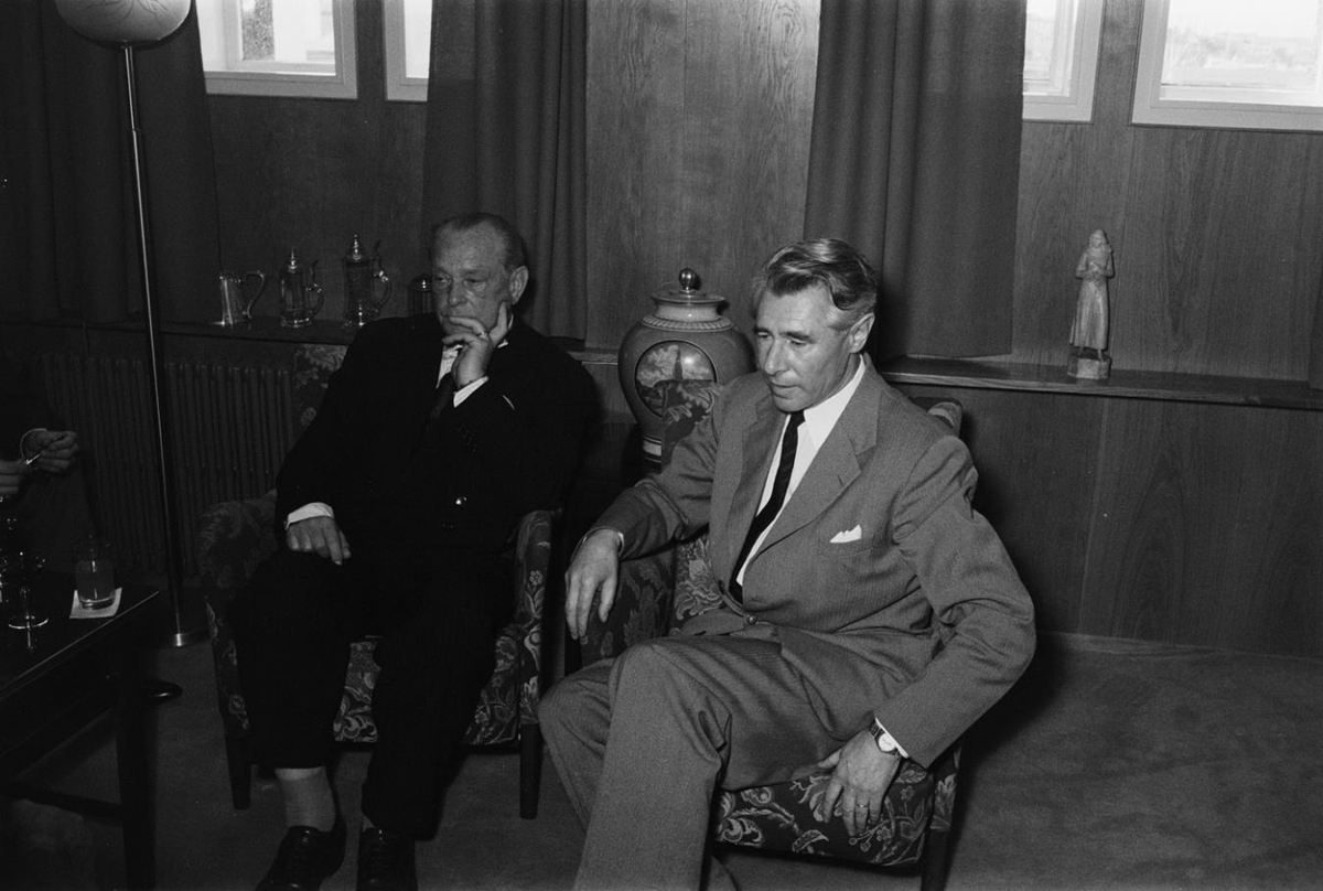 Tveir karlmenn sitja saman, annar er Guðlaugur Rósinkranz Þjóðleikhússtjóri.