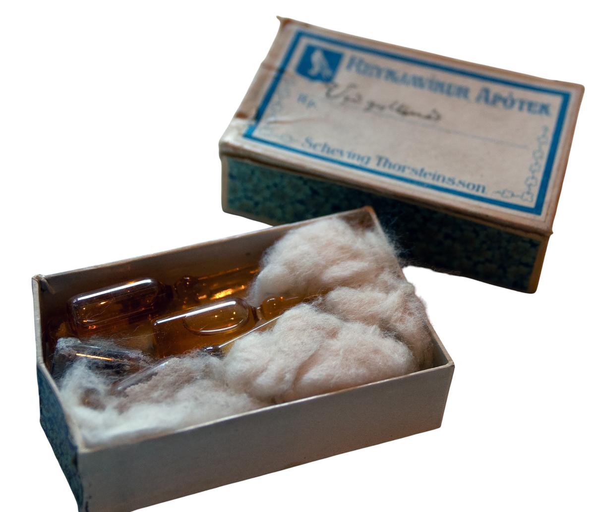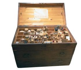 Efst er hólfað niður og innihalda lyfjaglös, grisjur o.fl. Einnig er fest með teiknibólum innan á lok leiðbeiningar sem hafa líklega fylgt kistunni.