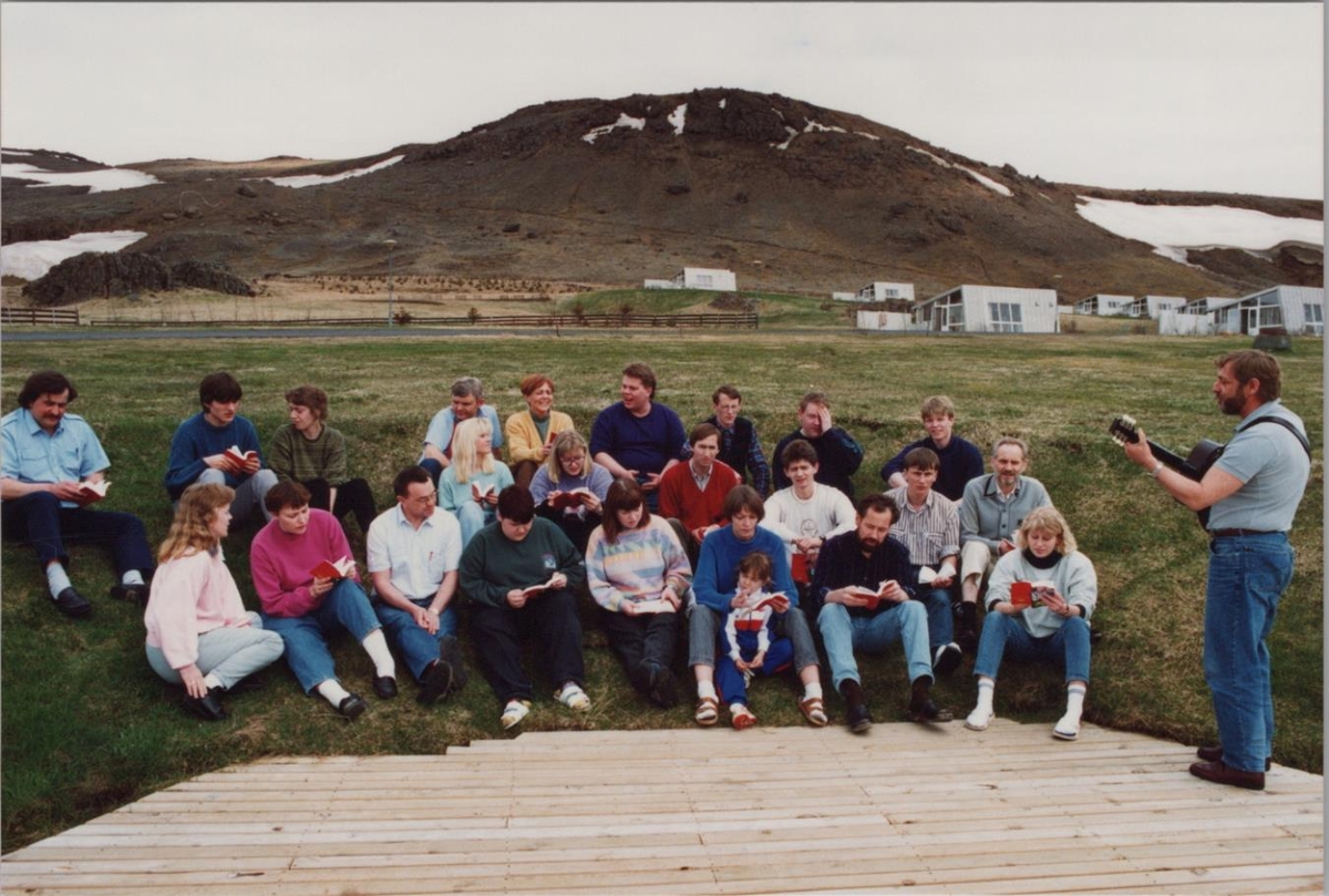 Gleðskapur í Ölfusborgum. Hljóðfæraleikari og sönghópur.