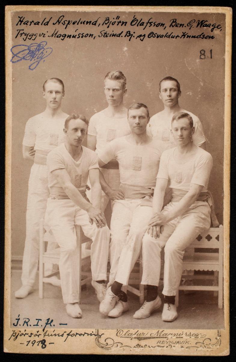 Á myndina er skrifað: Benedikt G. Waage, Harald Aspelund, Björn Ólafsson, Ósvaldur Knudsen, Tryggvi Magnússon, sitjandi Steindór Björnsson. Í.R. I. fl. - Þjórsártúnfararnir - 1918 -.