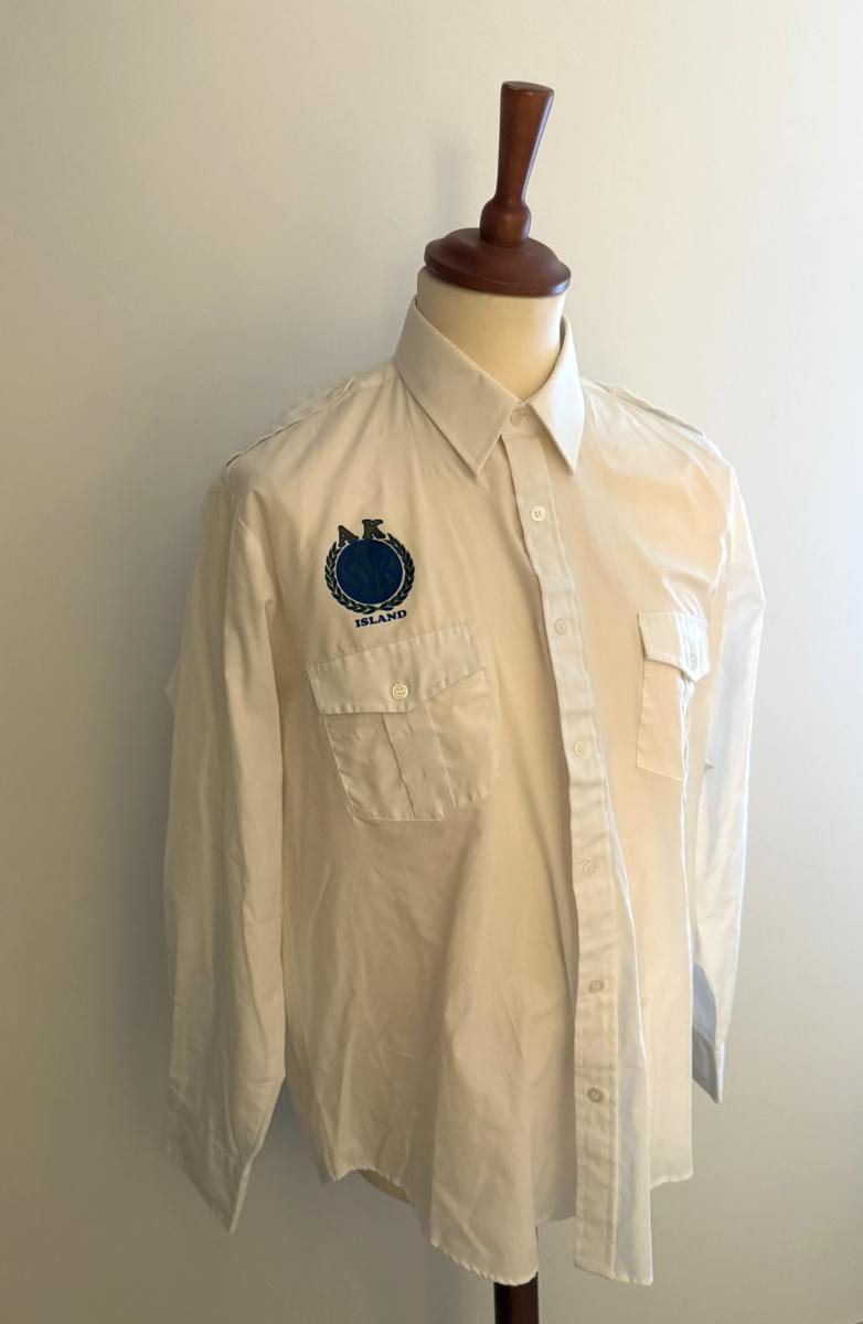 Skyrta vagnstjóra SVR-AK. Hvít með hvítum spælum á öxlum. Blátt og gyllt merki AK-SVR límt á hægra brjóst. Framleiðslumerki: Argatta. Stærð 42.