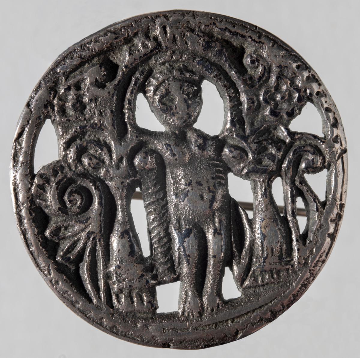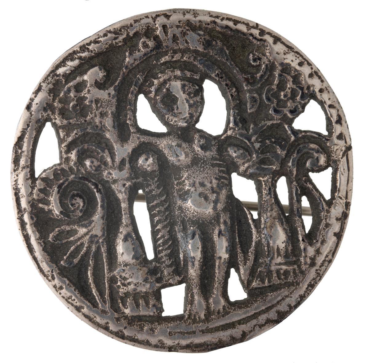 Silfurnæla, kringlótt. Nælan er talsvert máð og virkar gömul. Í miðju hringsins sér móta fyrir manneskja sem stendur undir boga. Til beggja hliða eru súlur eða stöplar og jurtaskreyti. Báðar hliðar eru líkar en þó ekki speglaðar. Á nokkrum stöðum í bakgrunni myndarinnar eru göt í gegnum næluna. Á bakhlið er prjónn til að festa næluna við flík. Á bakhlið er grafið „830S" og vísar það til hreinleika silfursins.