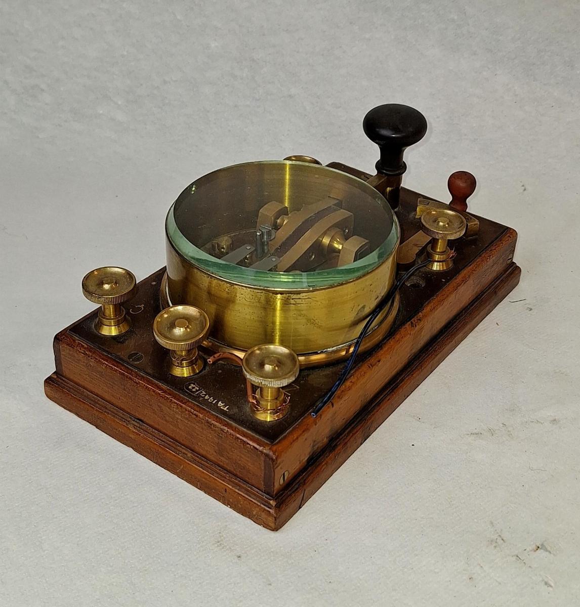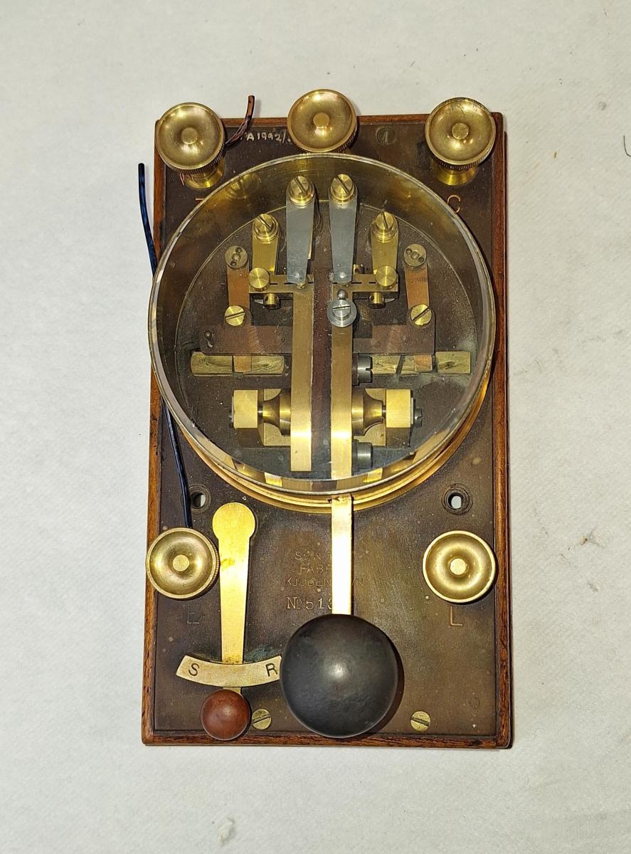 Morse-lykill úr messing, á trékassa. Glerlok yfir snertlum. Merkt: St. N. T. Ss Fabrik Kjøbenhavn No. 51346.
