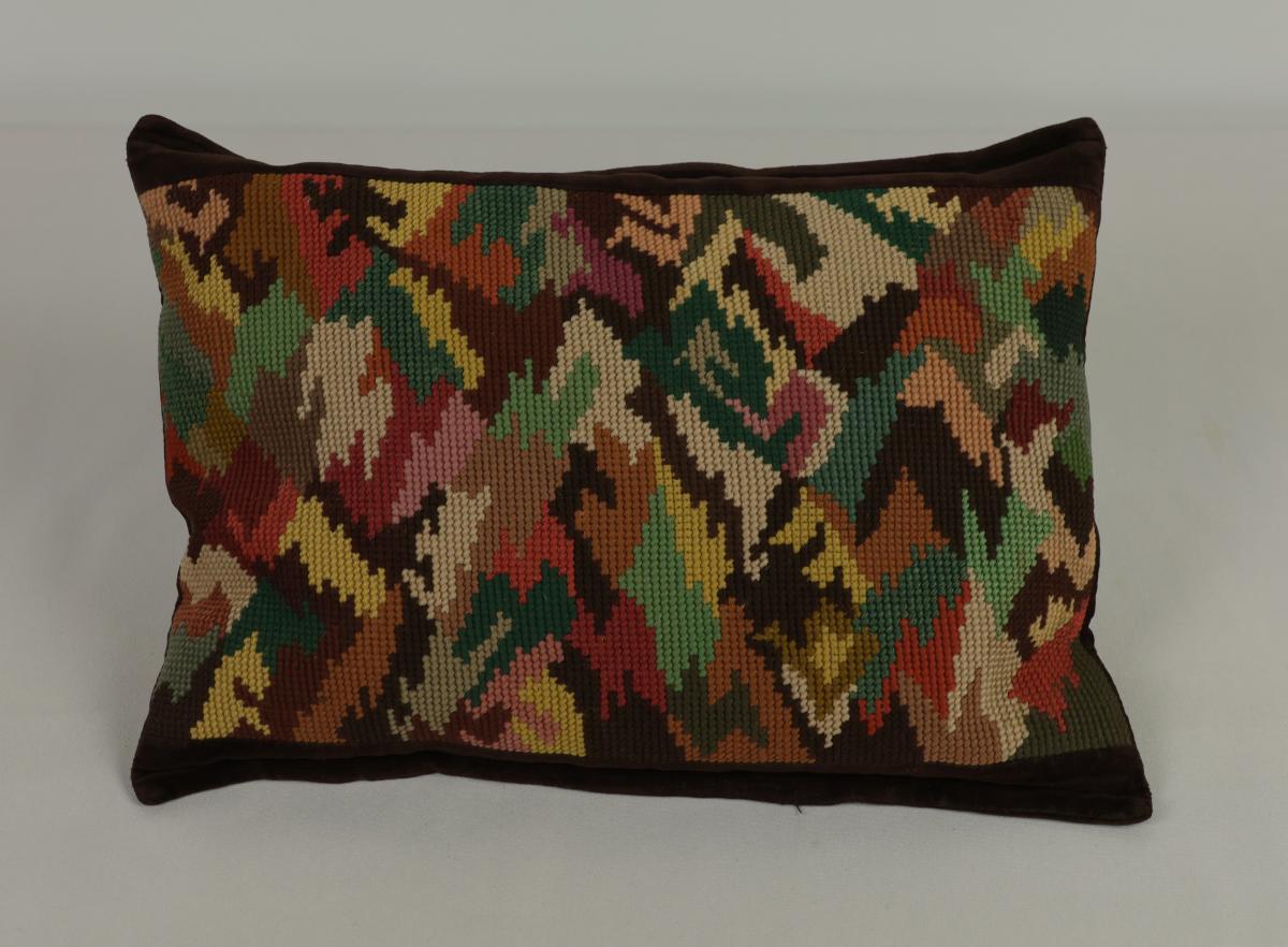 Brúnleitt efni, mynstrað. Guðmundur Andri Thorsson gaf Þórbergssetri. Púðinn er núna á skrifborðsstól Þórbergs Þórðarsonar á sýningu í setrinu.