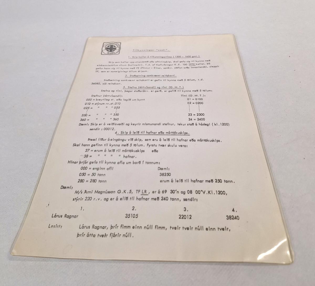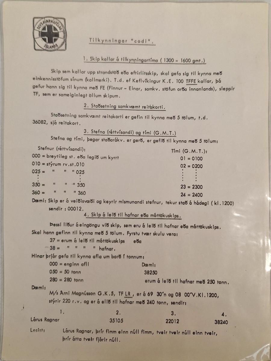Plastað leiðbeiningarblað merkt Slysavarnarfélagi Íslands með titlinum "Tilkynningar "codi"" þar sem leiðbeiningur eru til skipa um hvernig kallað skuli upp til strandstöðva eða eftirlitsskipa. Var notað við loftskeytastöðina sem starfrækt var á Seyðisfirði.