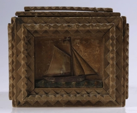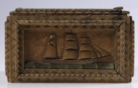 fjöl í hliðum. loki og botni, negldar útskornar flögumyndir, þrjú seglskip