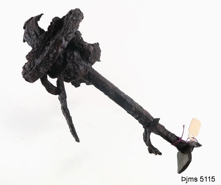 Verkfæri úr járni, mjög ryðtekið. Í Yfirliti í Árb. 1905 er sagt að þetta sjeu leifar af mellulás, en það held jeg þó ekki að geti verið. Þrjú samskonar verkfæri eru til hjer áður : 1106, 1802 (sbr. lýsingu) og 2044, og ennfremur eru nr. 947, 1044 og 3256 auðsjáanlega partur af samskonar verkfæri. Mjer er enn ókunnugt hvað þetta er og lýsi því þess vegna ekki að svo stöddu. Þetta er frá sama manni og fundið á sama stað og nr. 5113 og 5114. Jeg hefi nú fundið fleiri hluti hjer á safninu, sem auðsjáanlega eru úr samskonar verkfærum : 229, 437, 948-49 (947 er nefnt áður), 1807, 2627, 3043, 3257-58 (3256 áður nefnt) 3592-93. Ennfremur nærri heilt og afarstórt: nr. 2938.