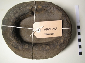 Kolan er sívöl í laginu með með ferkantaðri skál sem er höggvinn. Steinninn er rúnaður að neðan. Eldsummerki eru á skálinni. Gefandi fann koluna í öskuhaug vestast í Örfirisey um 1976 en um þær mundir braut úr honum.