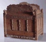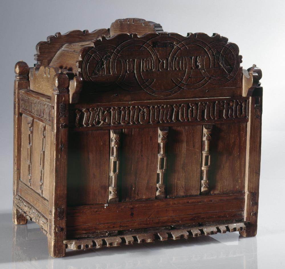 Lár, smíðaður úr furu að mestu leyti: að sumu leyti bæki og eik, stór og fallegur. L. 35,4, br. 23,5, h. 35. Hann er gerður með hinu gamla og rjetta láralagi, horn stuðlar 4 með rimum í milli efst og neðst, 4 spjöld í hliðum og 3 í göflum og útskornir stólpar í milli. Neðanvið neðri gaflrimar eru einnig útskornir listar, en neðri hliðarimar eru með strikum, sem munu þó ekki gerði(r) með hefli. Lík strik eru á spjöldum í lokinu og rimlum, og eru öll með fornlegum svip. Botninn stendur útundan hliðunum og er röndin útskorin. Burstirnar á lokinu, sem eru uppaf hliðunum, önnur úr bæk(i), hin úr eik, eru útskornar í röndina að ofan og útskurður er einnig framaná þeim, 3 kringlur á apturburstinni, ormur í miðkringlunni sex blaða blóm í hinum: en á hinni eru 5 hringar, sem ganga hver í annan og eru svo sem samtengdir með bondum(böndum), og milli þeirra höfðaleturs-stafirnir v e d a l, þ. e. V. E. dóttir á lárinn. Á milli miðra burstanna er svo sem kambur uppaf lokinu, útskorinn í röndina að ofan, hann er úr eik: beggja vegna við hann er svo sem þekja með broti eða brún á. Fyrir utan hana, en innanvið gaflana eru aðrir kambar, úr bæki með útsöguðum röndum að ofan og taka framendarnir 3 cm. framfyrir framburstina. Á efri rimunum milli stuðlanna eru skornar höfðaleturslínur og er sú áletrum þannig: i iesuundumf(?)adfafrid - fliodidrioda - semegkisvertusetta - hægrihlidherr, þ. e. þessi ferskeytla: