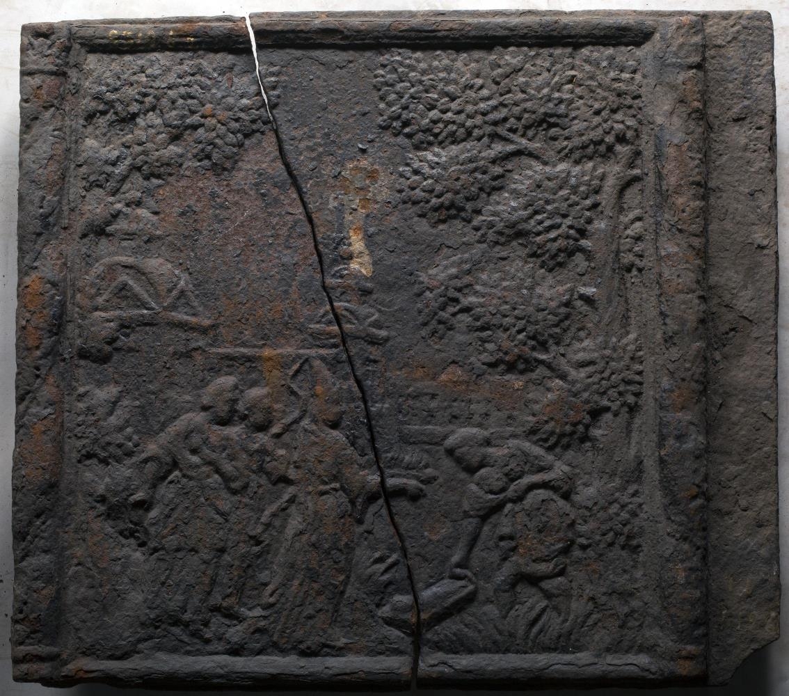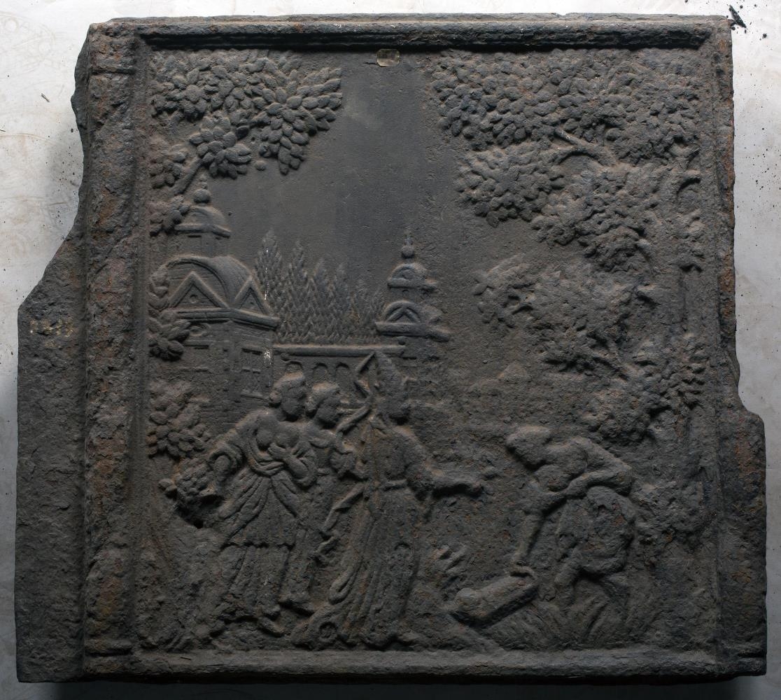Ofnplötur 2, hliðarplötur af gömlum bíleggjara. Hægri platan er brotin í tvent, hin heil að kalla: hún er 87 að br. + 9, sem hafa gengið inn í múrinn, og 87 að h. Á þeim báðum er sama myndin, upphleypt og með ágætu verki. Hún sýnir fund Mose í Níl: dóttir faraós og 2 konur fyrir aptan hana standa á bakkanum, en hin 4. veður útí og dregur upp körfuna með barninu í. Trje eru umhverfis. Hús með turnum bakvið. Sennilega frá norskri eða danskri járnsteypu og frá miðri 18. öld. Sbr. 8967.
