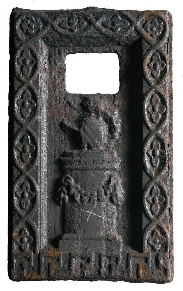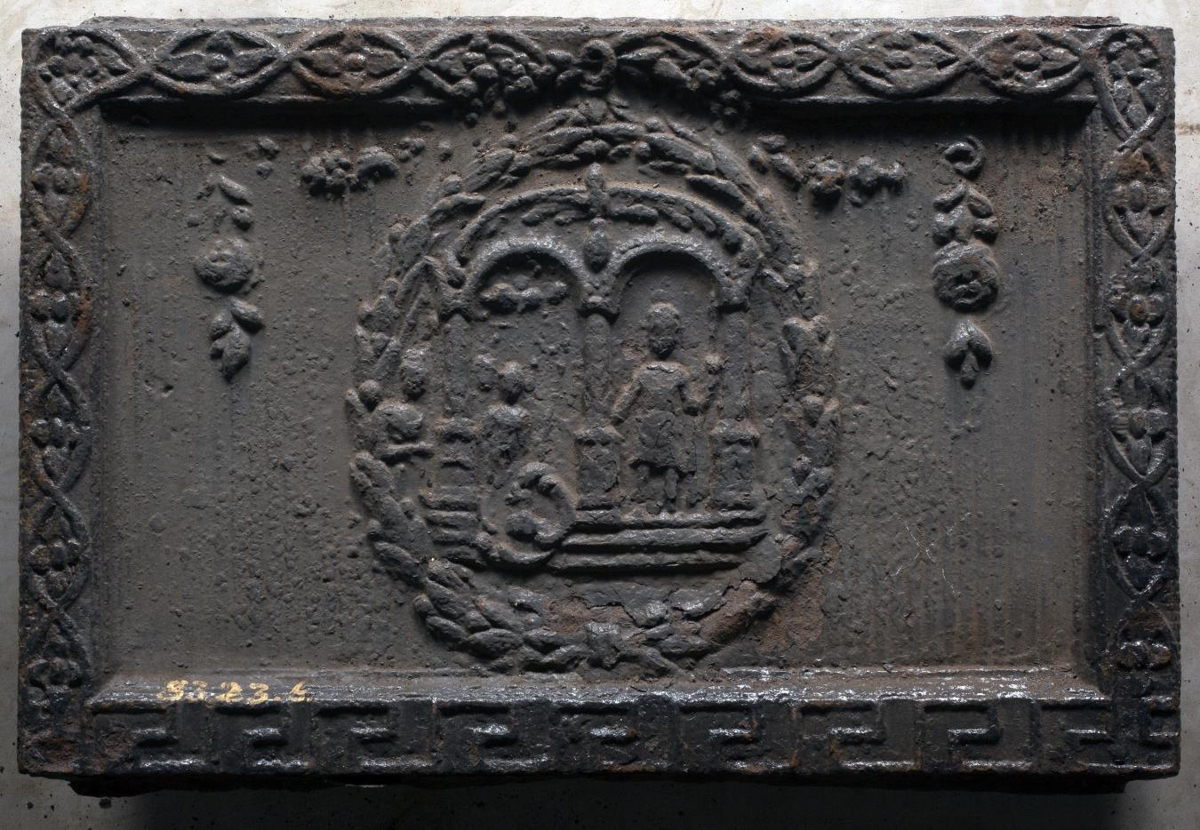 Ofnplötur 3, hliðarplötur 2 og aptari endaplata af gömlum vindofni. Hliðarplöturnar eru 74 að br. og 49 að h., en endaplatan er 27,5 að br. og að eins 45,5 að h., svo að hún hlýtur að vera úr efri hluta þessa ofns: skrautverkið í umgerðinni á öllum plötunum er nefnilega eins, og svo sem á nr. 112 í Gamle norske ovne, Katal. af Harry Fett, X'ania 1905, sbr. mynd aptanvið: hefur þessi ofn víst verið líkur þeim að gerð, sem þar er sýndur, en myndin á hiðunum þó önnur, eins konar tvöfalt hlið með mannamynd beggja vegna við miðsúluna. Ef til vill frá Mosse járnsteypu. Á litlu plötunni er stalli og hjálmur á. Op á henni er þar fyrir ofan, st. 9 x 7 cm.