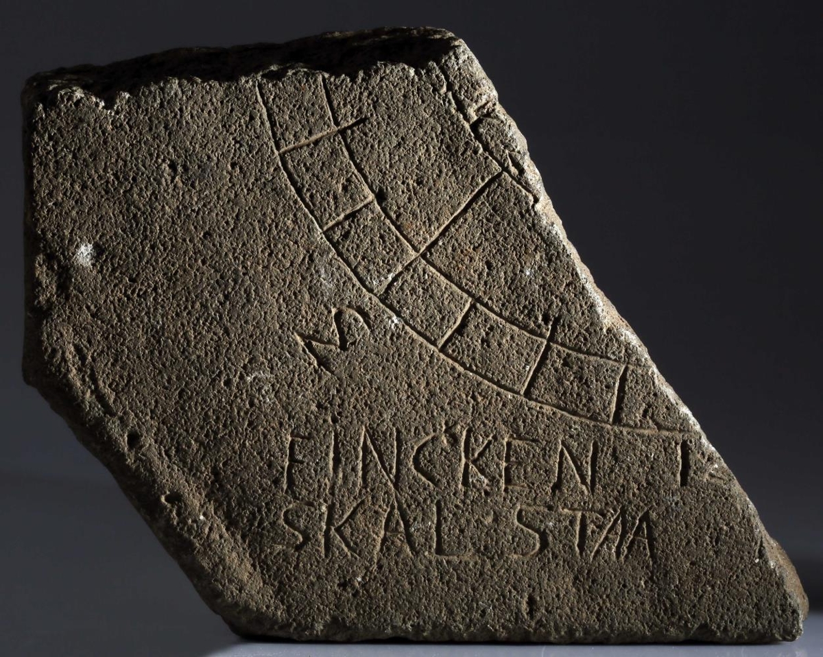 Brot af sólarsteini úr grágrýti, eitt hornið, og er sneytt af því. Laglega sljettað og grafið á framhlið: eru þar markaðir 2 sammiðja hringbútar með strikum á milli og hinn 3. innar og er 1 strik frá honum út að yzta boga: stendur þar 3 utan við. Fyrir utan hringabútana er letrað : FINCKEN SKAL STAA. Er þetta í 2 línum: 1. orðið í efri línunni . Út undan henni, við hringbútinn yzta, en 1 og hluti af öðrum staf. Óvíst hvað hjer er átt við með fuglsheitinu Finck(e). Geisli hringanna hefur verið 8,5, 12,3 og 14,4 cm. en fyrir utan yzta hring eru 7 og 7,5 cm. br. bil. Hefur steinninn því verið að minnsta kosti 35 cm. á hvorn veg. Þetta brot er um 17 og 19 að þverm., óreglulega tígulmyndað (tákn, sem er eins og þríhyrningur í laginu, AEG). Það fannst grunnt í jörðu á Bessastöðum, fyrir framan íbúðarhúsið þar. Hann hefur verið gerður hjer, en fyrir dani á Bessastöðum. Er sennilega frá 18. öldinni og kann að standa í sambandi við stjörnufræðis og veðurfræðis athuganir þeirra Eyjólfs Johnsoniusar og Rosmund Lievogs á Lambhúsum hjá Bessastöðum á síðasta fjórðungi 18. aldarinnar.