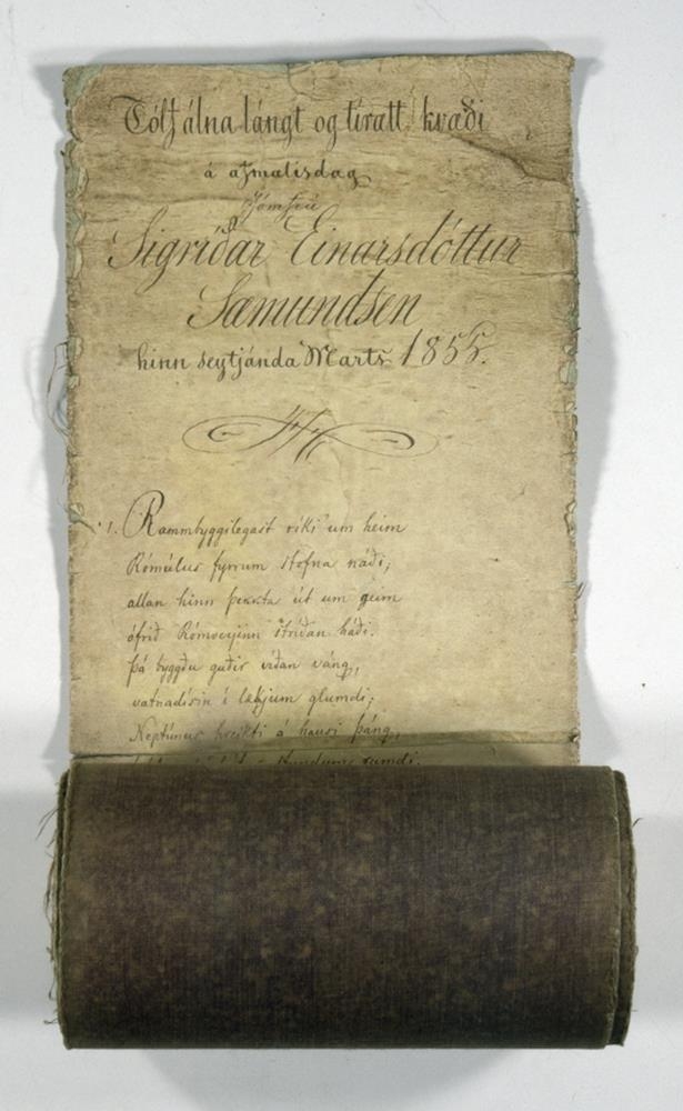 „Tólf álna lángt og tírætt kvæði“ á afmælisdegi Jómfrú Sigríðar Einarsdóttur Sæmundssen hinn seytjánda Marts 1855 Orkt og skrifað af Ben. Gröndal er á hvítum pappír, límdum á fjólublátt ljerept, og er vafið á trjekefli: br. 15,5, l. 7,58 (röskar 12 álnir). Sex síðustu erindin eru sett í 2 dálka og öll eru síðustu 9 erindin skrifuð þjett: en 8 línur eru í hverju erindi.