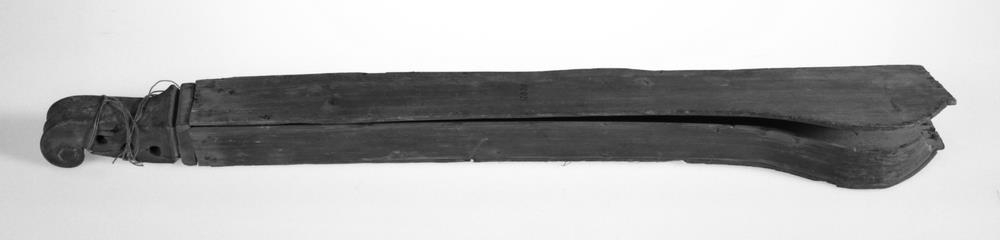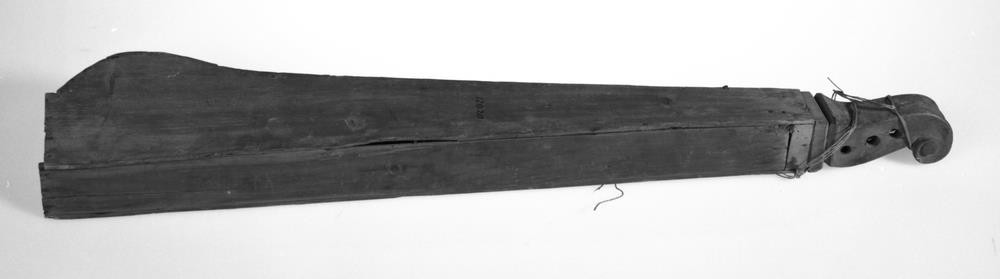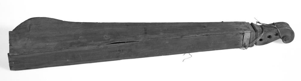 Langspil úr furu, mjög skaddað og strengja laust, með venjulegu lagi, lengd alls 77 cm þar af hausinn 13 cm, ekki ólaglega skorinn, hefur haft 3 strengjanagla, en aðeins einn þeirra er eftir, brotinn þó. Belgurinn er 5,4 cm þykkur og 5,2 - 8,5 cm breiður niður að bugnum, en um buginn er hann 11,9 cm. Fjalirnar í þeirri hlið, sem upp veit, og hliðinni með bugnum eru 3 mm á þykkt, en hinar 5 mm, og negldar eru þær saman með koparnöglum og járnnöglum, en eru nú meira og minna gengnar af neglingunum. Fjölina, sem verið hefur í neðri endannum, vantar einnig, sömuleiðis lista þá, sem strengirnir hafa verið spenntir á, enn fremur lista undir endunum báðum, sem langspilið hefur staðið á. Langspilinu fylgir 19 cm langur bútur af nótnafjölinni, laus. Ekkert kringlótt gat hefur verið ofan á belgnum, eins og venjulegast mun hafa verið. Frá Sama. Átti langspilið Þorbjörg, móðir Guðmundar landlæknis, en bróðir Hennar Eggert í Helguhvammi, smíðaði það.