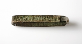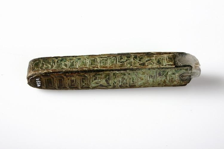 Fjórar ræmur úr látúni af hnífskafti (?), með höfðaletri, sem er ilt aflestrar. Þar virðist standa: éttu en - mig med Brandur Brandsso¦n¦. - Samsettar mynda þær ferstrendan hólk, 6,4 cm. að l., 1 - 1,2 á annan veginn, en 0,8 - 1,2 á hinn: 2 hafa myndað eina lengju, sem hefur verið beygð saman í miðju og hinar 2 hafa síðan verið festar við randirnar og eru tungumyndaðar aptast, en göt eru í gegn á hinum og hefur þar sennilega verið nagli í gegnum skaptið, óljósu orðin eru á annari þeirra og blóm aptast svo sem þar endi áletrunin. - Sennilega frá miðöldunum: varla yngra en frá 16. öld.