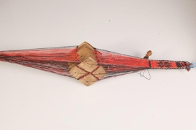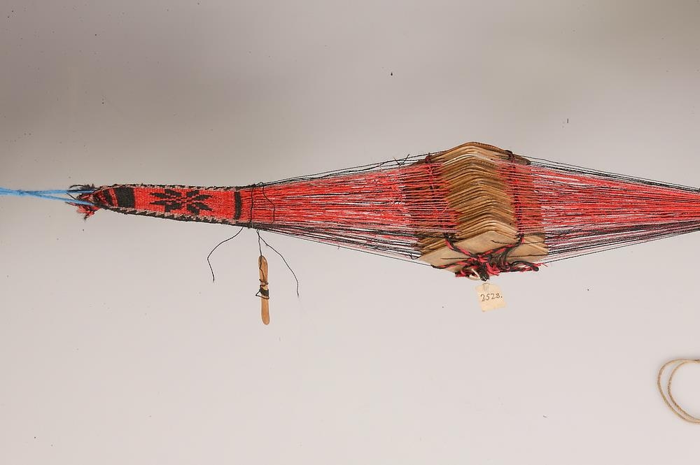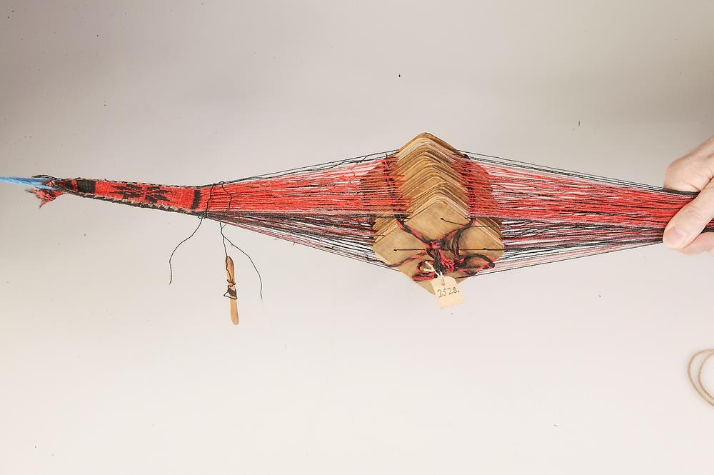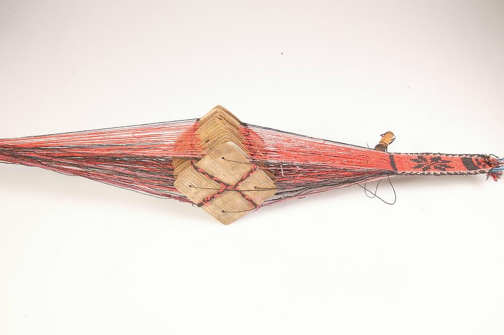 Spjaldvefur, spjöld og slanga með sýnishorni af ofnu bandi, gert árið 1884.