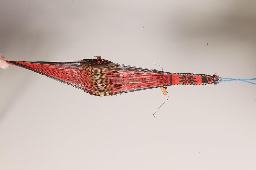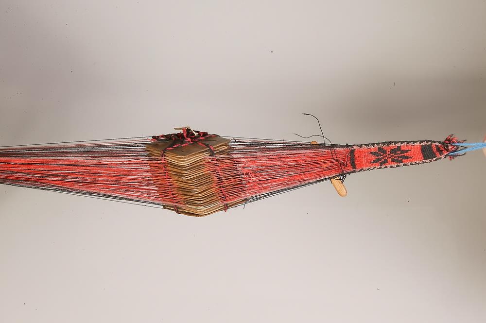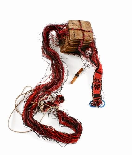 Spjaldvefur, spjöld og slanga sem byrjað er að vefa á skrautofið band. Sýnishorn er Vilborg Guðmundsdóttir gerði árið 1884.
