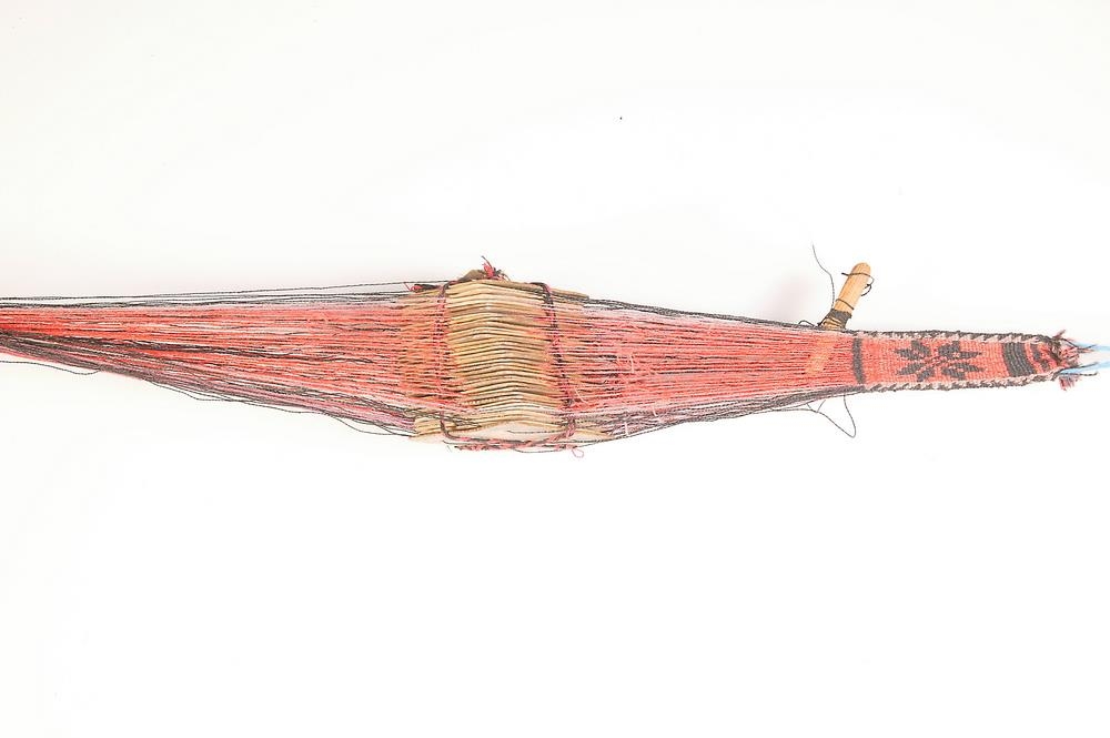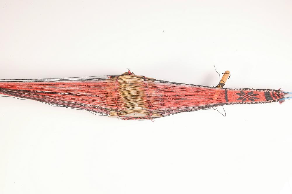 Spjaldvefur: slanga, sem byrjað er á að vefa úr 3 cm. breitt band, svart með rauðu átta blaða blómi, annars vegar, hins vegar er bandið rautt með svörtu blómi, 36 vefjaspjöld úr eik og bæki, um 7,7 x 7,5 cm. að stærð, venjuleg að gerð, og smáskeið 7,1 cm.l. spýta, 1 cm.br., ávöl og bogadregin fyrir endana. Sýnishorn þetta af spjaldvefnum gjörði gef. að ósk forstöðumanns safnsins og sendi því að gjöf. Um spjaldvefnaðinn sögu hans og útbreiðslu ritaði Margrethe Lehmann - Filhis ritgerð í Zeitschrift dr. Vereins f. Volkskunde 1899, með mörgum myndum. Sbr. nr. 3207 og 7037.