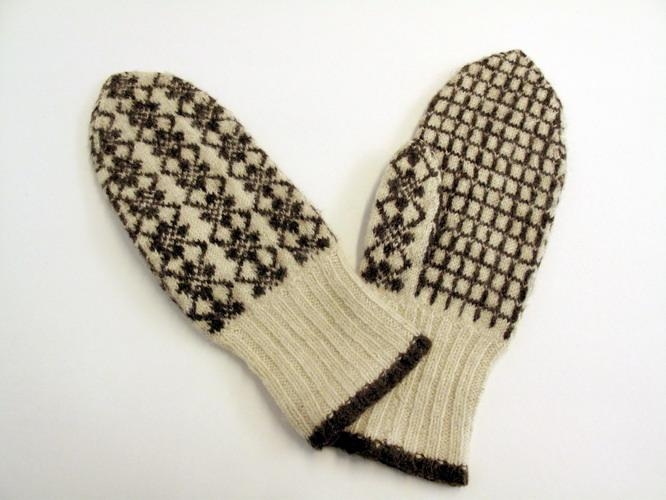 úr hvítu og brúnu ullarbandi, grönnu, með tvíbandsprjóni, en bekkja- og