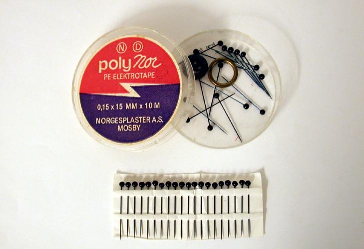35 svartir títuprjónar með kringlóttum haus úr svörtu plasti (svartri plastkúlu). 20 prjónanna eru nældir saman á hvítan pappír. Títuprjónarnir eru allir saman í glærri, hringlaga plastöskju sem upphaflega hefur verið utanum rafmagnstape. Í öskjunni eru einnig svört lítil tala og málmhringur. Títuprjónarnir voru notaðir til að festa skotthúfu á höfuð sem borin var við peysuföt og upphlut.