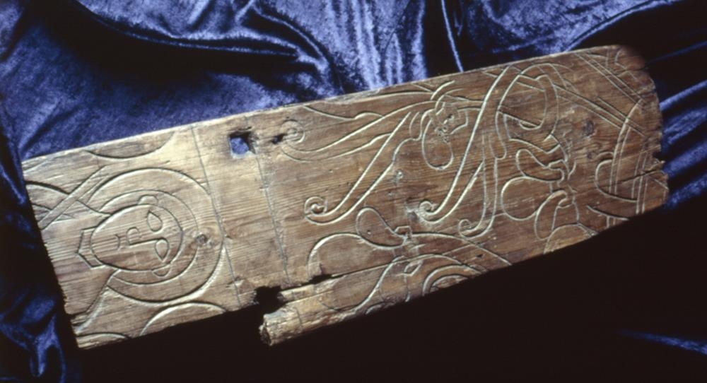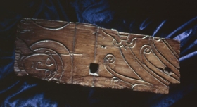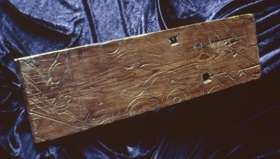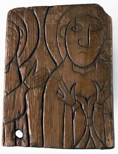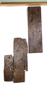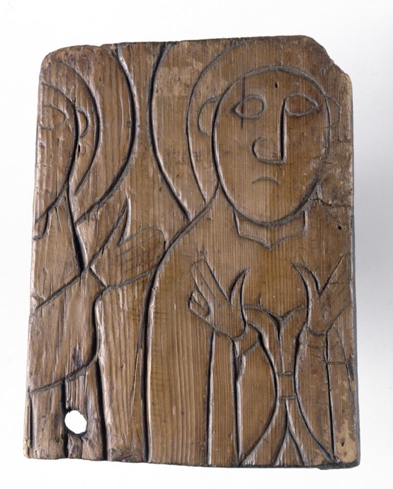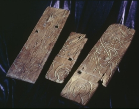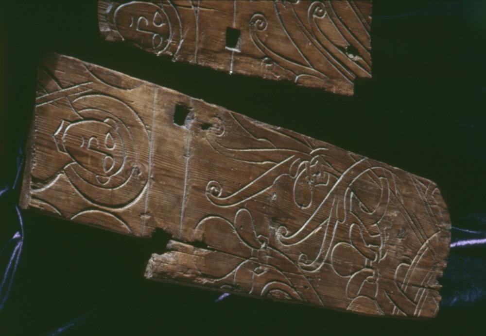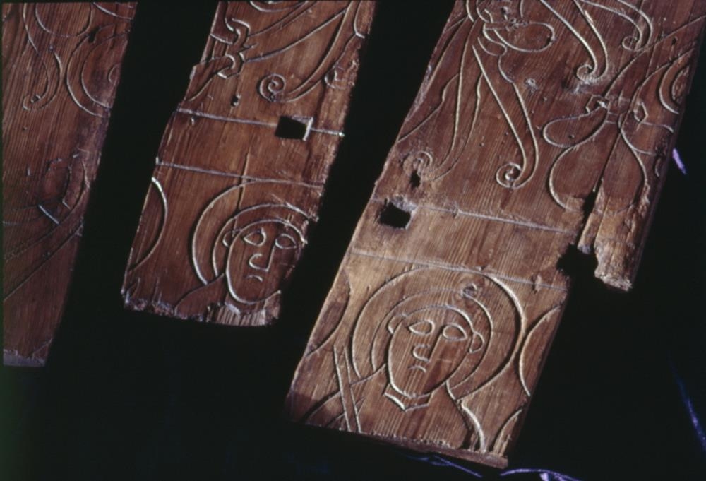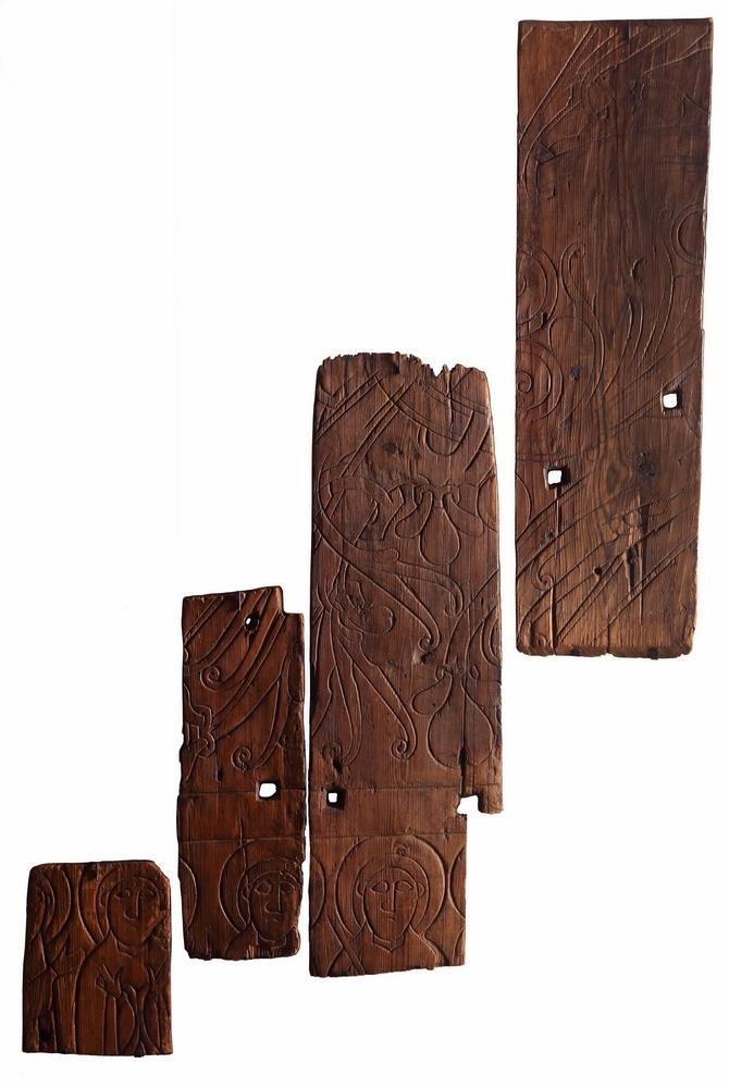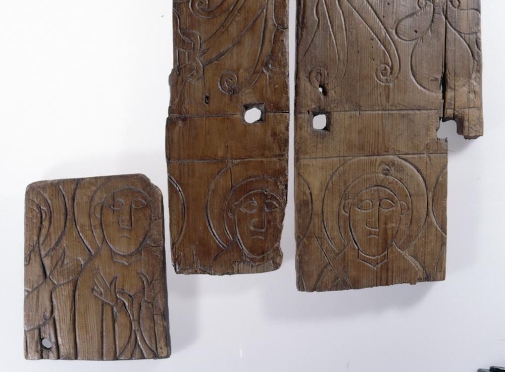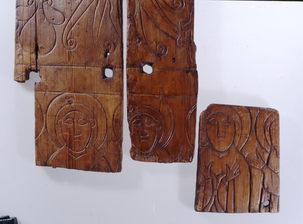 Carved wooden boards, last used in an old turf farmhouse at Flatatunga, demolished 1952. Four fragments of boards have survived, with carved images of holy men and ornament in the Ringerike style. The boards have the original nail-holes, which demonstrates that they were originally part of a picture, and not a wall. The hypotheses has been argued that these are remnants of a large carved picture of Christ and the apostles in the cahedral of Hólar in the time of St. Jón Ögmundsson, in the early 12th century. These devotional images are believed to be the oldest of their kind in the Nordic world.