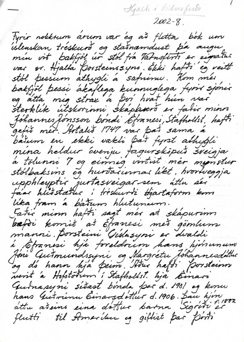Skápur með útskorinni hurð. Sjálfur skápurinn hefur verið endurnýjaður sbr. skýrslu gefanda um feril skápsins sem er að finna í fylgiskjalamöppu aðfangabókar. Þar telur hún að vel geti verið að hurðin sé skorin af Hjalta í Vatnsfirði. Sjá skjal í skjalaglugga.