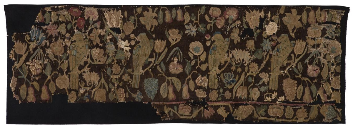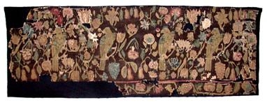 ofið í með ýmsum litum fuglar og blóm á mósvörtum grunni. Líklega