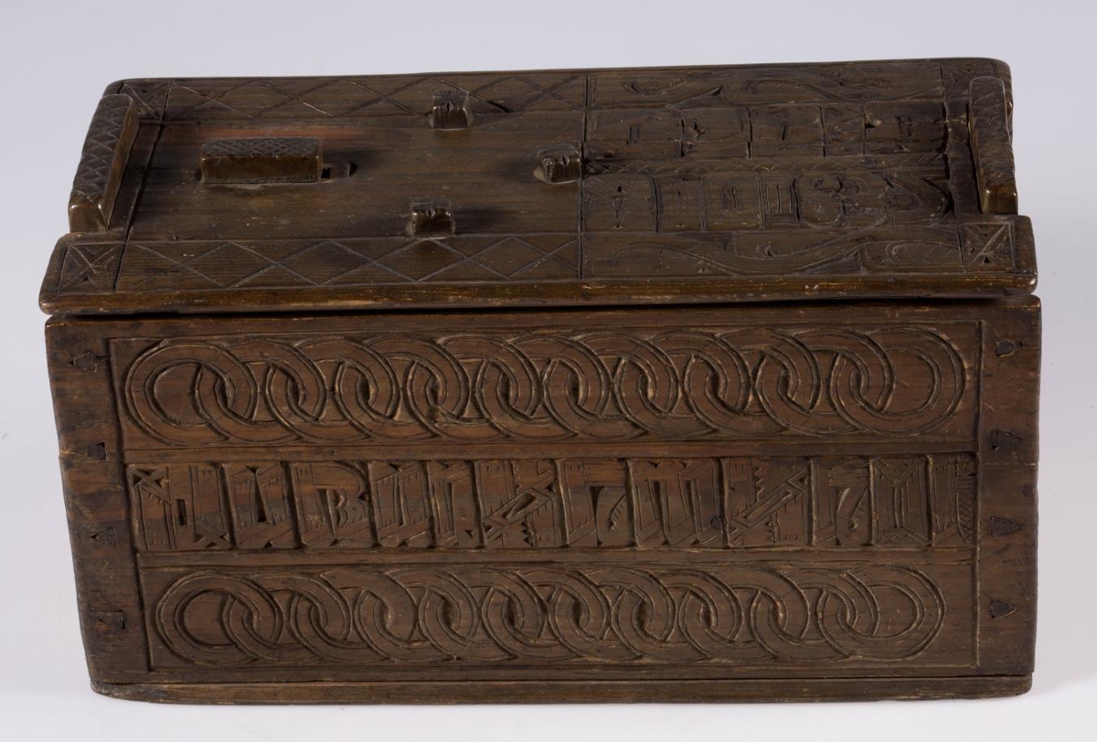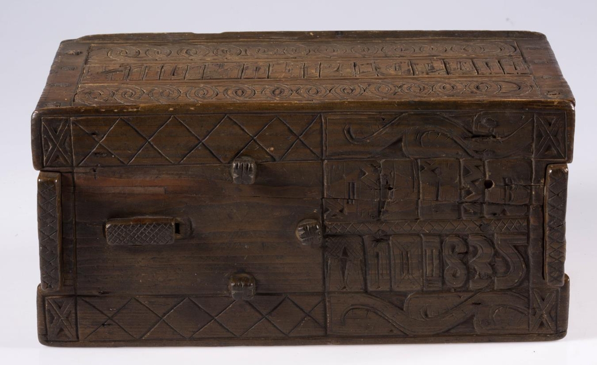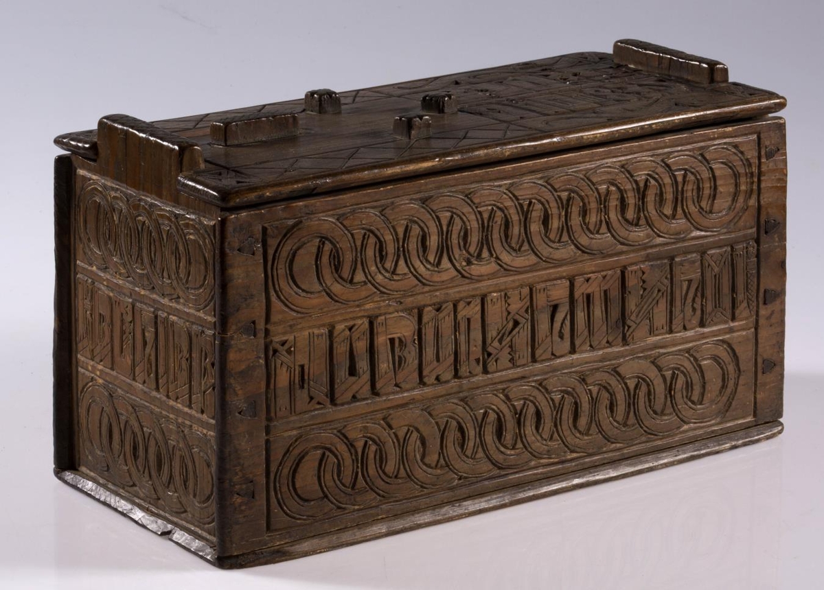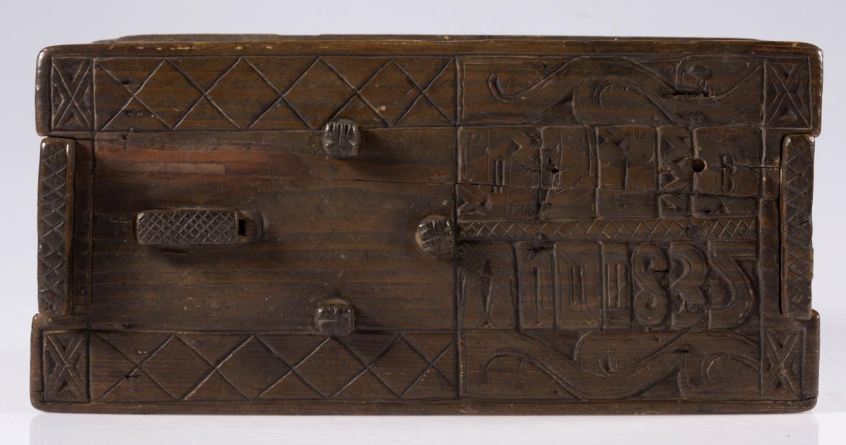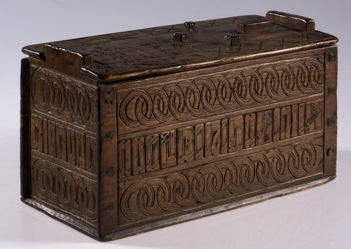 Stokkur, smíðaður úr furu og útskorinn. Hliðar, botn og lok hvert um sig úr einni fjöl, og er fest um samskeyti með trénöglum. Lengd 42.2 sm, hæð mest (við gafla) 23.5 sm, breidd 20.6 sm. Lokinu er smeygt inn undir uppistöður á miðjum göflum og er læst með tappalæsingu við annan gaflinn. Uppi við hinn gaflinn er handraði. Lokið skiptist að ofan í reiti með ristum línum. Hægra megin á því er áletrun, með höfðaletri og arabískum tölum. Í efri línu eru fyrst þrír stafir: annað hvort GLD eða HLD, en aftan við þá er A. Í neðri línu þessarar áletrunar: ANO 1835. Framhliðin skiptist í þrjá lárétta aðalreiti, með ristum línum, eins og lokið. Í efsta og neðsta reit eru skornir samkræktir hringar, en í miðreitnum er áletrun. Sams konar tilhögun er á hinum hliðunum. Ef lesið er frá framhlið og farið hringinn, hljóðar áletrunin: HUAUR SEM SEOT / KINAUDG / RUNDAIEIGUSINILS / TABEIAF. Hún er fyrst í stað auðskilin: Hver sem stokkinn auðgrund á í eigu sinni, en því næst taka við skammstafanir, sem ekki verður lesið úr.* Skurðurinn er allur fremur grófur. Stafirnir í áletruninni mega kallast skýrir í úrlestri, en sá, sem skar hefur notað ýmsa óvenjulega höfuðletursstafi og orðið á að víxla stöfum. Guðmundur Þorsteinsson gerði við stokk þennan 1960 og setti þá m.a. lok á handraðann. Stokkurinn er úr eigu frú Torfhildar Hólm. Fékk hún hann frá móður Þuríðar Lange, Björgu Jónsdóttur frá Háagerði á Skagaströnd. Sjá um frú Torfhildi undir Þjms. 15260. Skápur með sams konar verki er í Glaumbæ.
