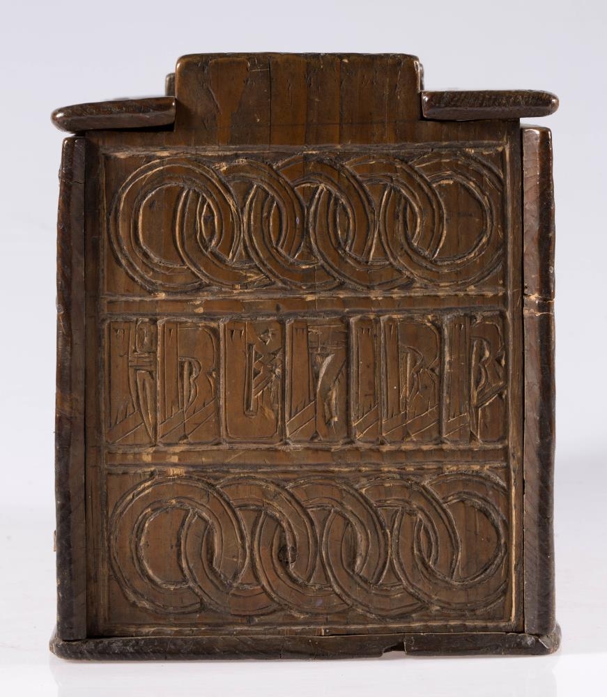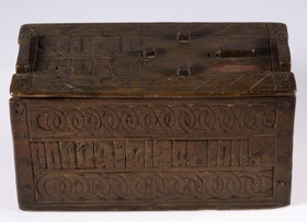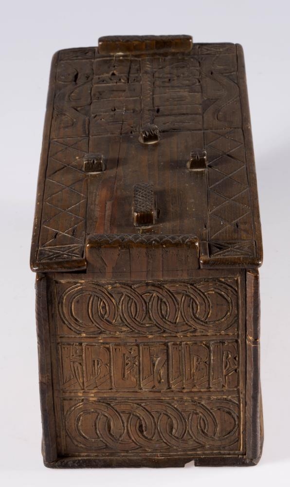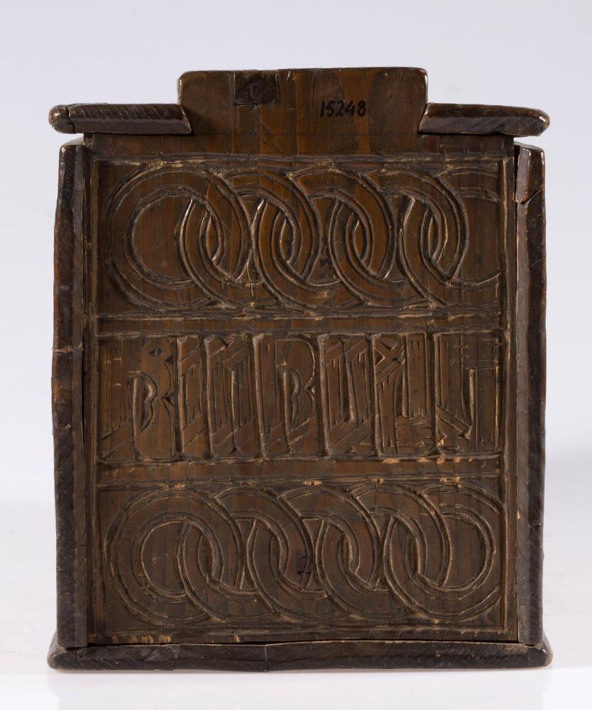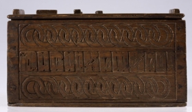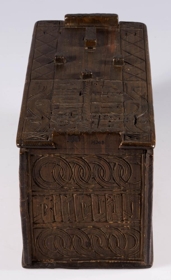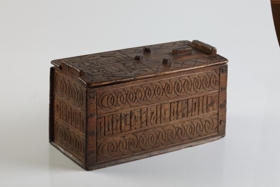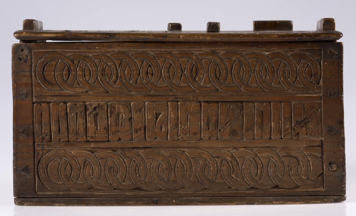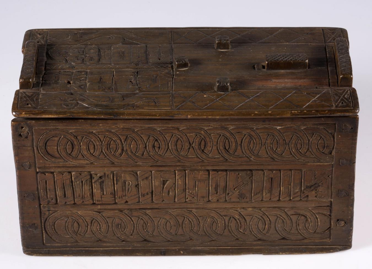 Stokkur, smíðaður úr furu og útskorinn. Hliðar, botn og lok hvert um sig úr einni fjöl, og er fest um samskeyti með trénöglum. Lengd 42.2 sm, hæð mest (við gafla) 23.5 sm, breidd 20.6 sm. Lokinu er smeygt inn undir uppistöður á miðjum göflum og er læst með tappalæsingu við annan gaflinn. Uppi við hinn gaflinn er handraði. Lokið skiptist að ofan í reiti með ristum línum. Hægra megin á því er áletrun, með höfðaletri og arabískum tölum. Í efri línu eru fyrst þrír stafir: annað hvort GLD eða HLD, en aftan við þá er A. Í neðri línu þessarar áletrunar: ANO 1835. Framhliðin skiptist í þrjá lárétta aðalreiti, með ristum línum, eins og lokið. Í efsta og neðsta reit eru skornir samkræktir hringar, en í miðreitnum er áletrun. Sams konar tilhögun er á hinum hliðunum. Ef lesið er frá framhlið og farið hringinn, hljóðar áletrunin: HUAUR SEM SEOT / KINAUDG / RUNDAIEIGUSINILS / TABEIAF. Hún er fyrst í stað auðskilin: Hver sem stokkinn auðgrund á í eigu sinni, en því næst taka við skammstafanir, sem ekki verður lesið úr.* Skurðurinn er allur fremur grófur. Stafirnir í áletruninni mega kallast skýrir í úrlestri, en sá, sem skar hefur notað ýmsa óvenjulega höfuðletursstafi og orðið á að víxla stöfum. Guðmundur Þorsteinsson gerði við stokk þennan 1960 og setti þá m.a. lok á handraðann. Stokkurinn er úr eigu frú Torfhildar Hólm. Fékk hún hann frá móður Þuríðar Lange, Björgu Jónsdóttur frá Háagerði á Skagaströnd. Sjá um frú Torfhildi undir Þjms. 15260. Skápur með sams konar verki er í Glaumbæ.