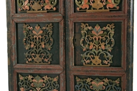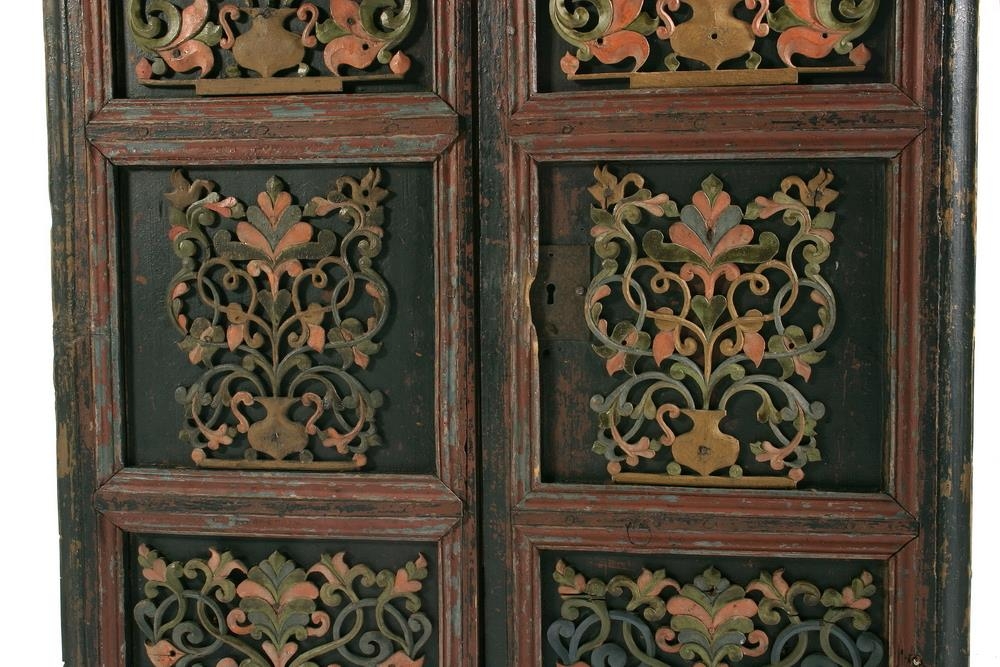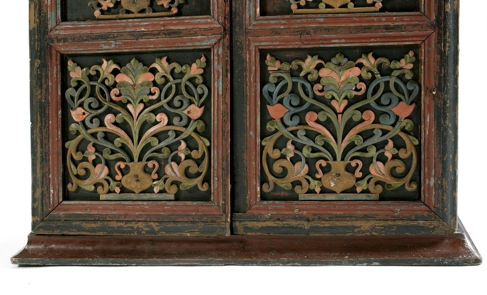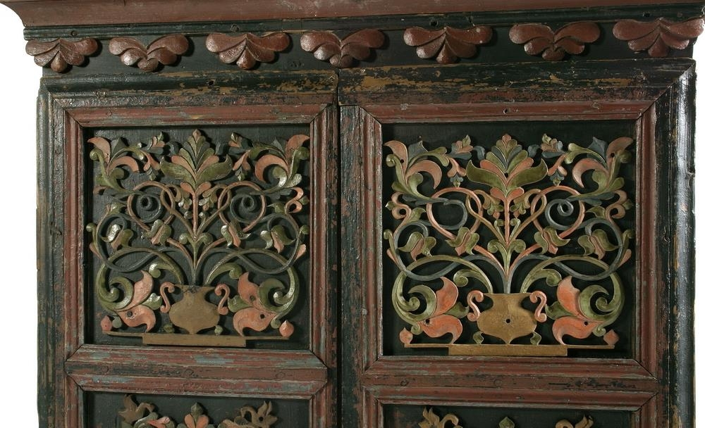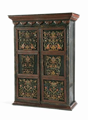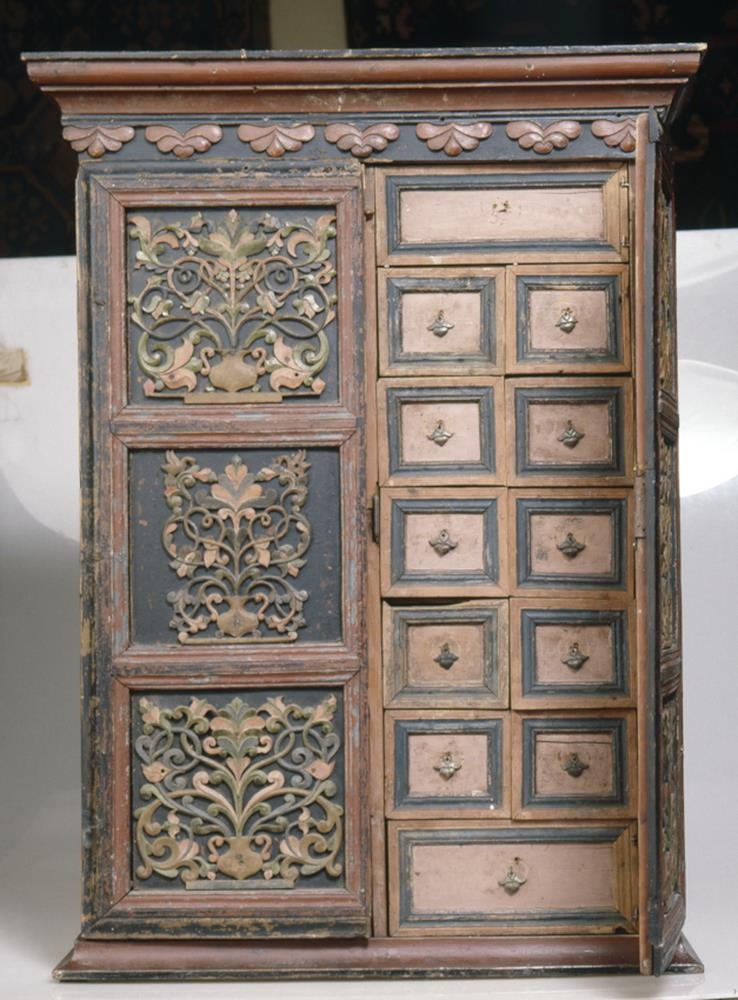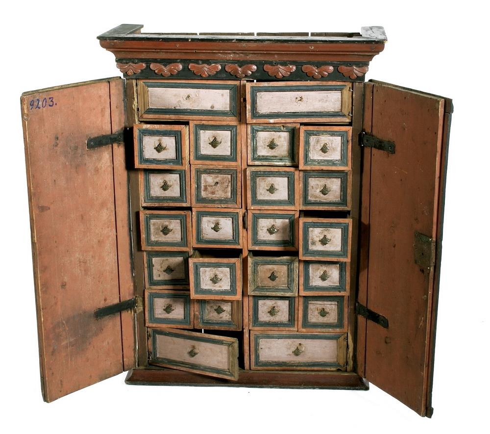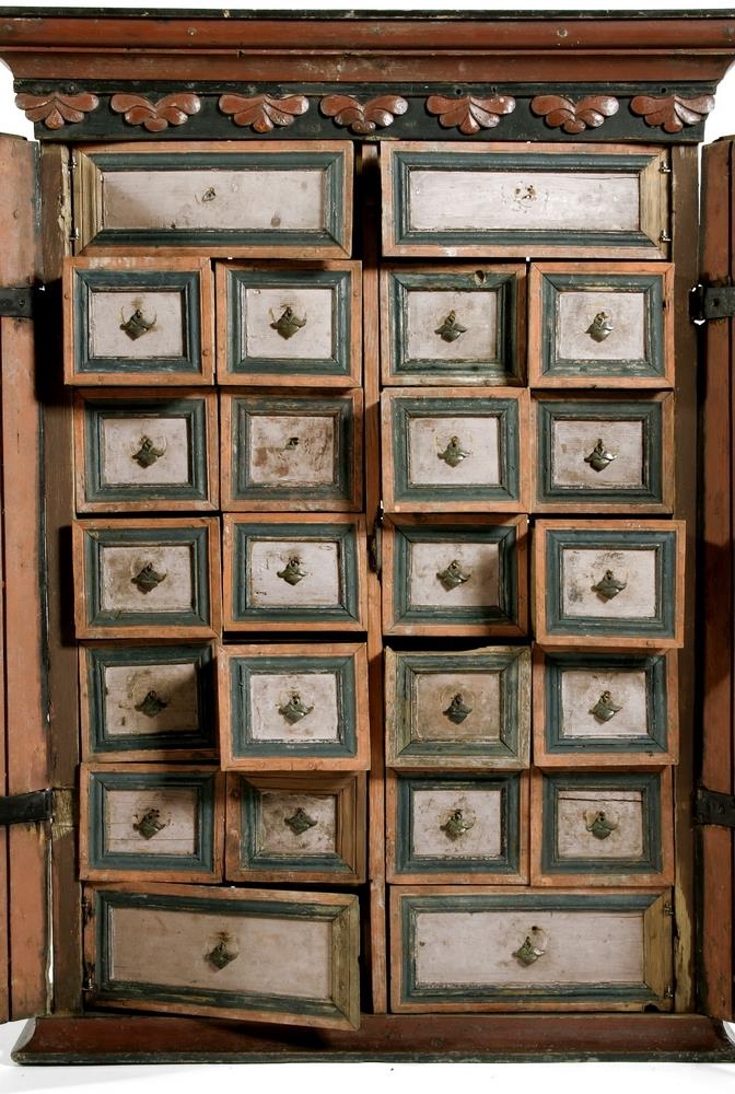 Skápur úr furu, málaður svartur, að mestu leyti, að utan: L. 94,5 cm., br. 61, d. 24,5. Hatturinn stærri og með rauðum lit mest. Hann er með 2 hurðum, sem falla saman á miðju. Ofan þar, í milli þeirra og hattsins, eru fest á framhliðina efst 7 útskorin, rauð, lauf. Hvor hurð er með 3 spjöldum eða reitum að utanverðu og eru strikin á umgerðunum rauð. Á hverjum reit er stórt blóm í blómkeri: þau eru með gagnskornu verki og máluð ýmsum litum: Sýnilega alt eptir sama smið og kistlarnir nr. 867, 901 og 1859: er sams konar verk á þessu öllu frábrugðið öðru í safninu. Innanvið hurðirnar eru 4 hólf og 20 skúffur í skápnum: eru 2 stór hólf efst og aftur 2 eins neðst, en 2 og 2 skúffur saman í 5 röðum hvoru megin. Hólfhurðirnar og skúffugaflarnir eru með bleikrauðum og bláum strikum, og látúnslauf í miðju til að taka í. Hefur verið fremur gott smíði á þessu öllu, og útskurðurinn mjög snotur. Sig. Guðmundsson fullyrðir, að nr. 901 sje eptir Hallgrím Jónsson, föður Þorláks í Skriðu, sjera Gunnars í Laufási, Jóns málara og þeirra annara mörgu systkina. Hann var fæddur 2. des. 1717, gekk í Hólaskóla 1731, kvæntist 3. nóv. 1737 og fór að búa á Naustum, þar sem faðir hans bjó. Hann þótti gáfumaður og smiður var hann mikill. Hjer eru margir aðrið útskornir munir í safninu eptir hann með annari gerð en þessi skápur og kistlar ( 2605, 2757, 3613, 5213, 5719, 6509, 7292, og má ske 606 ?), flezt er það með erlendum blæ og ber vitni um útlend áhrif: Hallgrímur var kallaður bíldhöggvari ( þ.e. bildhauer) Hann dó 30. sept. 1785. - Skápurinn var endurbættur nokkuð er hann var kominn til safnsins, m. a. gerður útskurður í efsta reit á hægri hurð eptir þeim efsta á hinni. Skápnum er læst, en lykill týndur. - Eggert Ísdal kom með upphaflega skrautið á hægri hurðina efst 25/8 80, hafði fundið það í dóti föður síns Ingvars Ísdals. Setti það á 28/8 og fékk í staðinn það sem Matthías hafði látið gera. Kvað hann föður sinn hafa fengið að halda eftir þessu skrauti er skápurinn var látinn til safnsins (líklegast hefur Ingvar Ísdal gert við skápinn ). Þ.M.