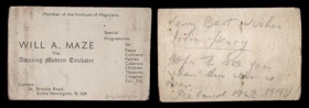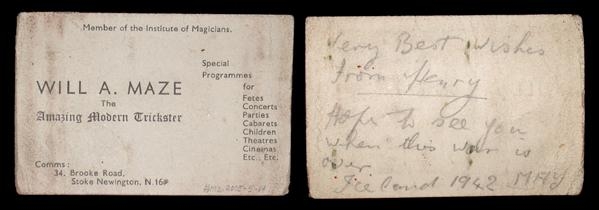 WILL A. MAZE The Amazing Modern Trickster Member of the Institute of Magicians. (Fleiri upplýsingar koma fram á kortinu). Kortið er prentað en á bakhliðina er skrifað með blýanti: Very best wishes from Henry Hope to see you when this war is over. Iceland 1942 MAY.