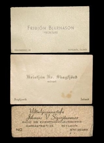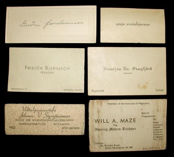 Sex mismunandi nafnspjöld úr fórum Guðna Marjóns Þorsteinssonar, öll á hvítum pappír. Á þeim stendur: