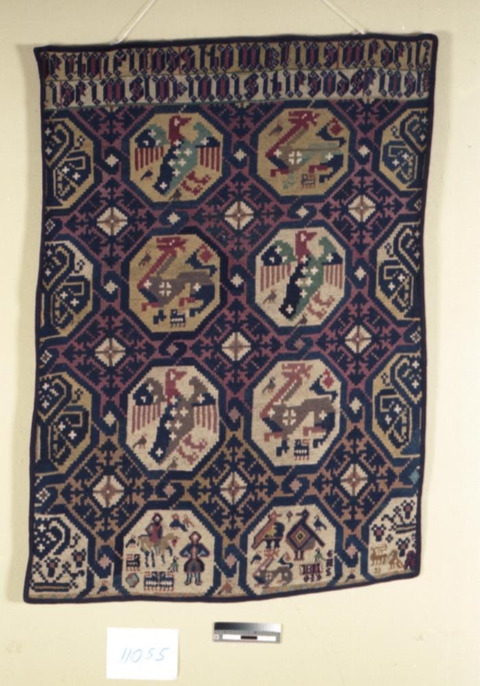 Ábreiða, útsaumuð öll með fljettusaumi af ömmu gefanda, Ólöfu Jónsdóttur, konu Erlendar Árnasonar í Hellisfirði (bróður Ingunnar skyggnu, sem átti Odd, bróður Ólafar). Eru upphafsstafir þeirra hjóna, OID og EAS, saumaðir í einn reitinn, neðst, og ártalið 1811 hjá: þá mun ábreiðan hafa verið saumuð. -Ólöf Jónsdóttir var móðir Guðrúnar Erlendsdóttur, móður gefanda (en hún, Ólöf Bjarnadóttir, er nú 96 ára að aldri: er ekkja Pjeturs Sveinssonar í Vestdal á Seyðisfirði: -sonur Sveins alþm. í Vestdal: þau Ólöf Jónsdóttir og Oddur, á Skeggjastöðum, voru komin af Rafni lögmanni). - Ábreiðan er 159 x 121 cm. að stærð. Hún er með átthyrndum reitum: eru 2 raðir af (nær) heilum átthyrningum í miðju, upp og ofan, og 1 hvoru megin af (nær) hálfum átthyrningum yzt: eru í þeim fuglar, kynjadýr, trje, mestmegnis gamlar myndir, úr eldri ábreiðum og reflum: er grunnliturinn gulur (eða ljós) í þessum átthyrndu reitum, en átthyrningarnir sjálfir um þá eru dökkbláir, og sömul. greinar á milli þeirra, en grunnurinn undir þeim er rauður. Efst er bekkur með 2 leturlínum dökkbláum stöfum á gulum grunni, með rauðum lit innan -í þó, og stendur þar: vertu ifir og altumkring medeili/(f)ri geimslu þinnisitieguds eingl. - Stendur hjer geimslu fyrir blessun. - Framhaldið er (svo sem kunnugt er): ar saman í kring- sænginni yfir minni. - Ábreiðan er vel gerð, áþekk hinum gömlu fljettusaumsábreiðum safnsins, en heldur lausari og með gildara bandi. - Hún var á Landssýningunni þ.á. í Reykjavík, og gaf gef. hana safninu, er það falaði hana til kaups. - Hún hefir nýlega verið földuð eða brydd allt um kring með dökkbláu efni til varnar jöðrunum. - Sbr. e.fr. nr. 11057.