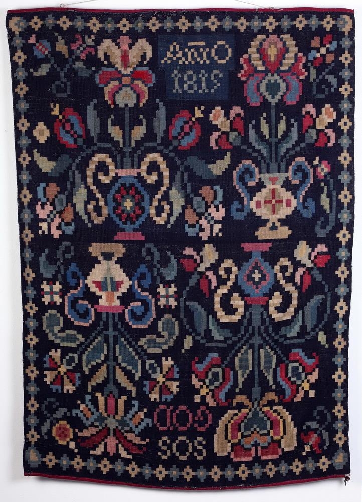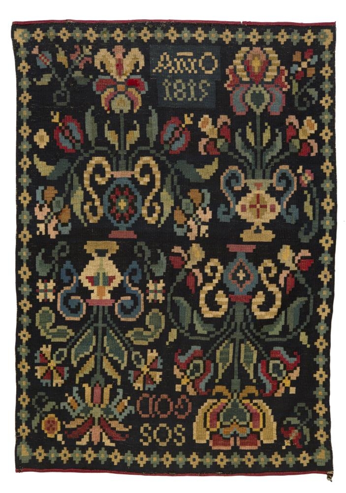 Ábreiða krossofin, dökkblá að lit: í hana eru ofnir 4 urtapottar, er standa á miðri ábreiðunni og breiðast leggir og blöð sit til beggja enda: rósir þessar eru stórgerðar til að sjá og með ýmsum litum, rauðar, grænar, bláar og gular: í hornunum eru og sérstakar rósir og alt í kring er bekkur af grænum og gulum tíglum. Á öðrum enda ábreiðunnar og milli rósanna standa stafirnir SOS og GOD, sem eru fangamörk þeirra hjónanna Stefáns amtmanns Ólafssonar Stephensens á Hvítárvöllum og konu hans Guðrúnar Oddsdóttur, en á hinum endanum er ANO 1815. Ábreiðu þessa hefir Þórður yfirdómari Sveinbjörnsson ofið meðan hann var skrifari amtmanns á Hvítárvöllum. Ábreiðan er heil og óslitin að mestu.