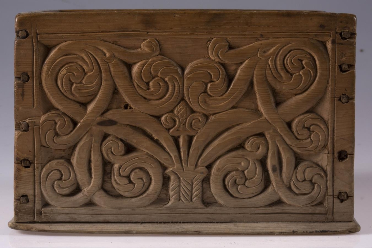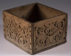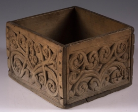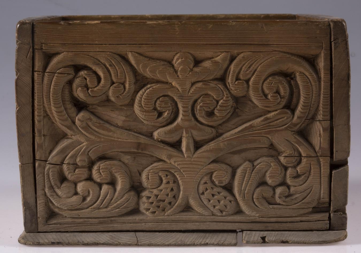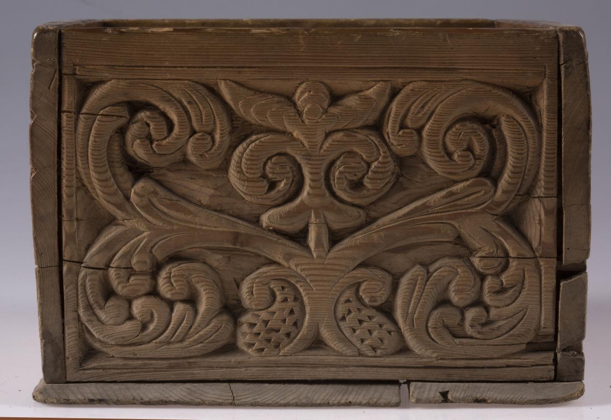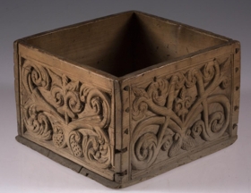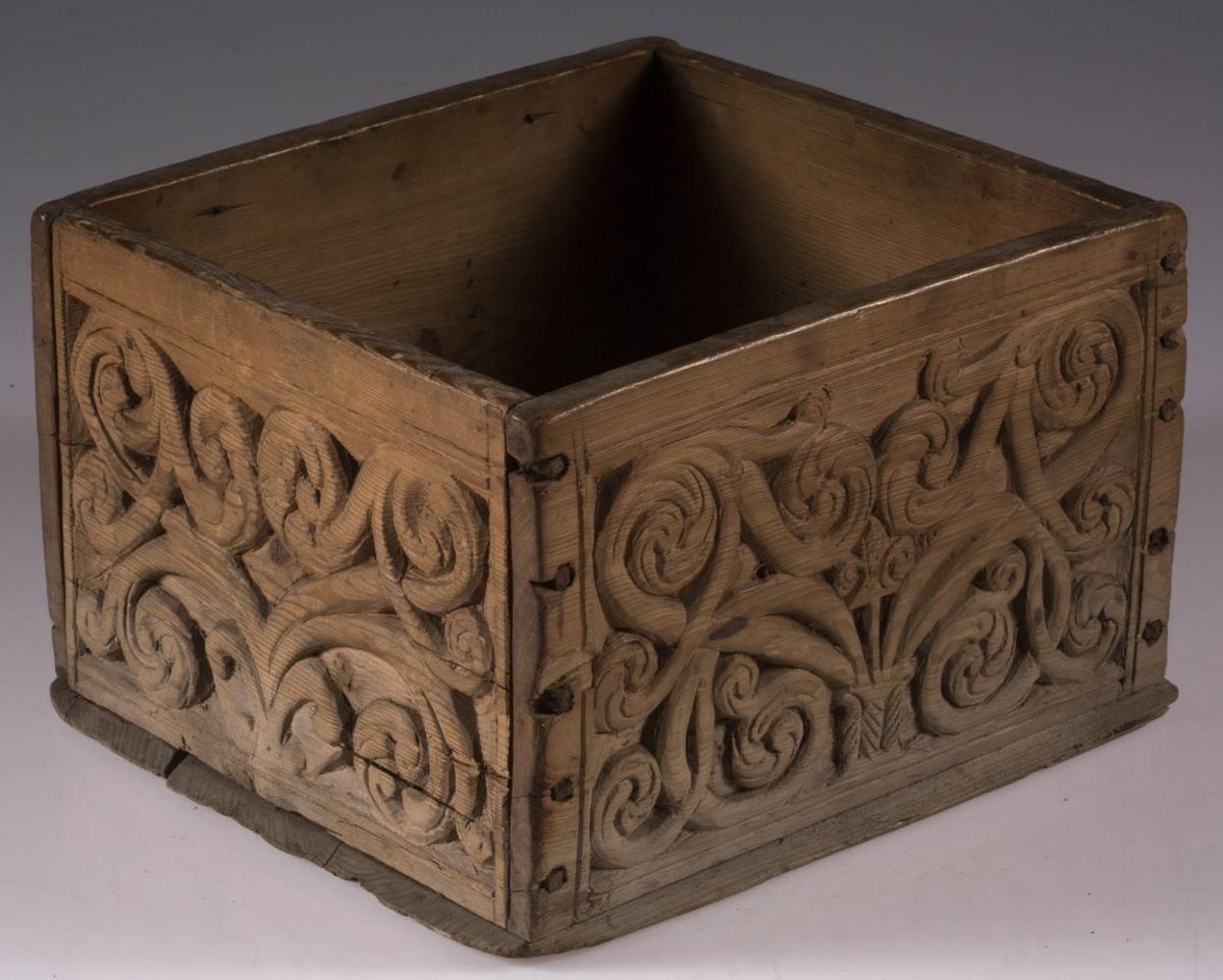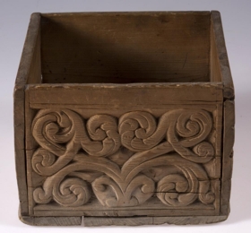 Kassi úr furu, 21x22 cm um sig, 14,5 cm að h., trénegldur allur. Hliðarnar eru allar útskornar, og eru munstrin hvert öðru ólík, en þó öll byggð upp á sama hátt, eins og nátturlegt blóm með blaðastrengjum, sem hefst frá botni á miðri hlið og breiðist síðan út yfir allan flötinn, líkt og blómskraut á glitofnu áklæði. Skrautverkið er allt upphleypt og minnir mikið á útskurðinn á kistlinum nr. 91 og 4183. Ekkert lok er á kassanum og engin merki sjást eftir lamir eða lás. - Var áður í eigu frú Guðlaugar Jensdóttur.