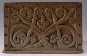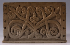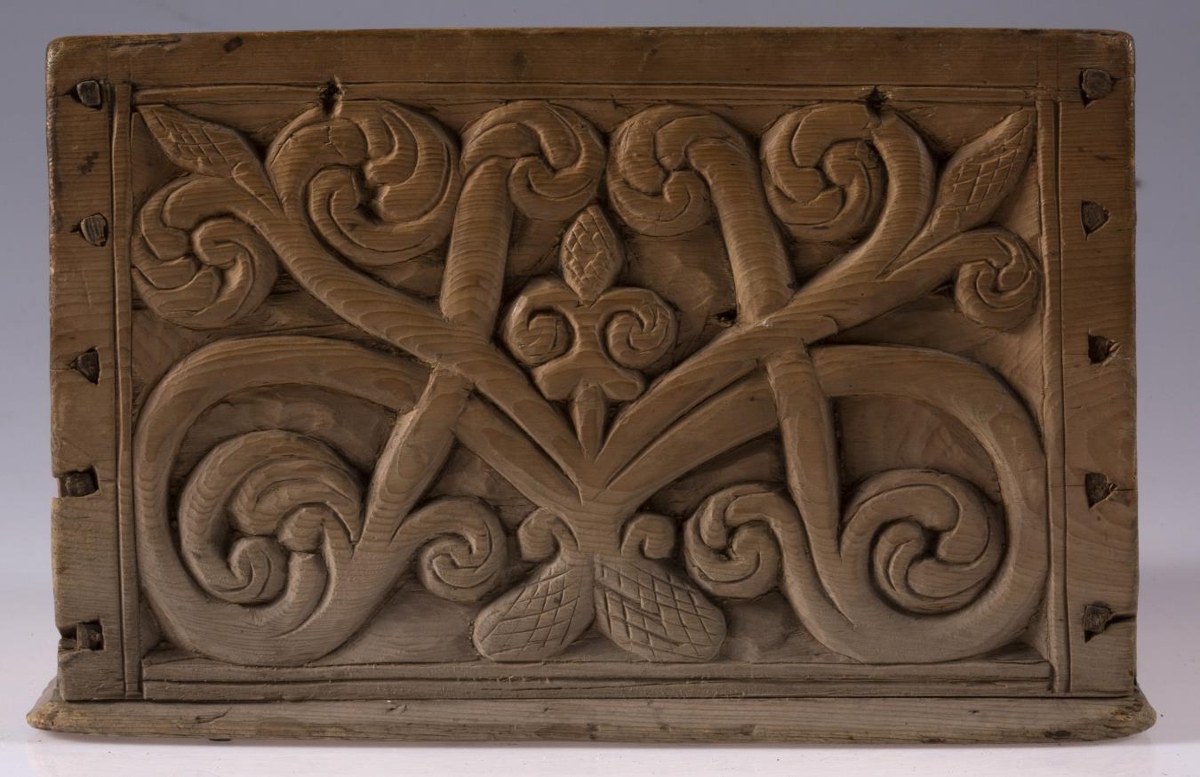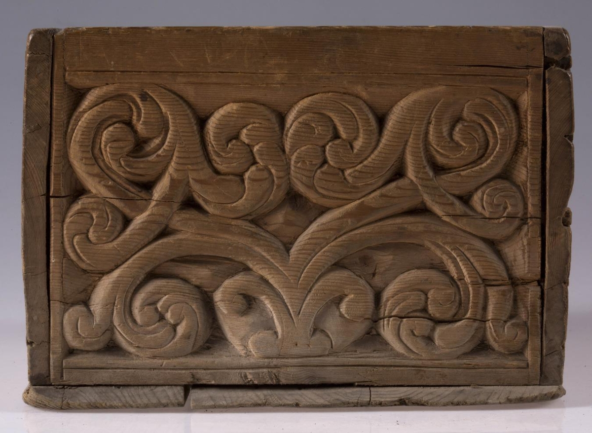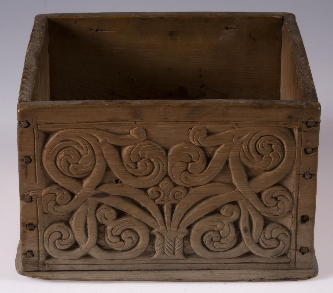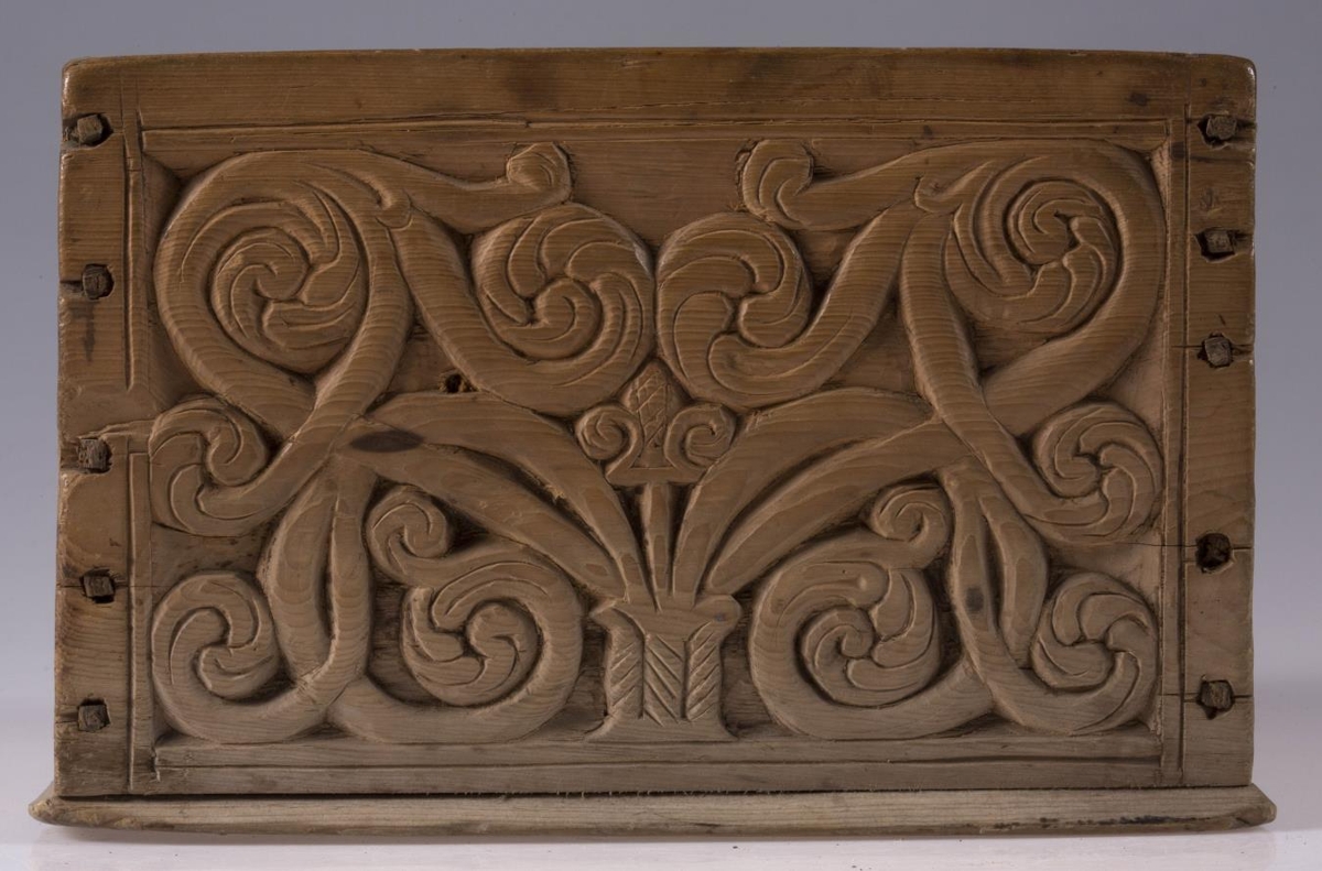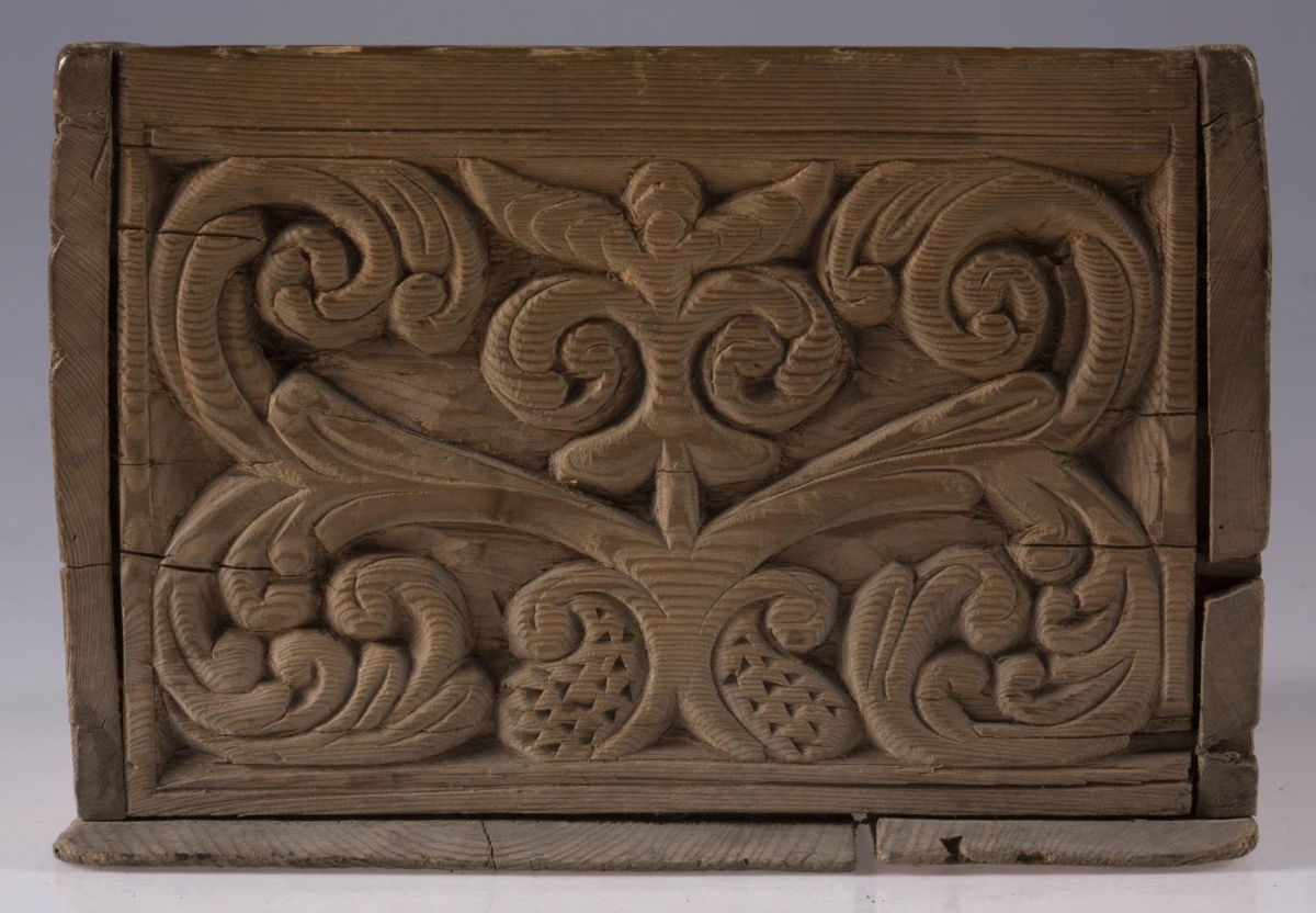 Kassi úr furu, 21x22 cm um sig, 14,5 cm að h., trénegldur allur. Hliðarnar eru allar útskornar, og eru munstrin hvert öðru ólík, en þó öll byggð upp á sama hátt, eins og nátturlegt blóm með blaðastrengjum, sem hefst frá botni á miðri hlið og breiðist síðan út yfir allan flötinn, líkt og blómskraut á glitofnu áklæði. Skrautverkið er allt upphleypt og minnir mikið á útskurðinn á kistlinum nr. 91 og 4183. Ekkert lok er á kassanum og engin merki sjást eftir lamir eða lás. - Var áður í eigu frú Guðlaugar Jensdóttur.