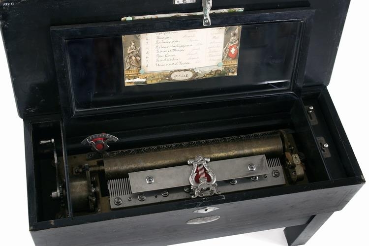 Undir lokinu er annað lok með gleri í ramma spilverkinu til hlífðar. Spiladósin