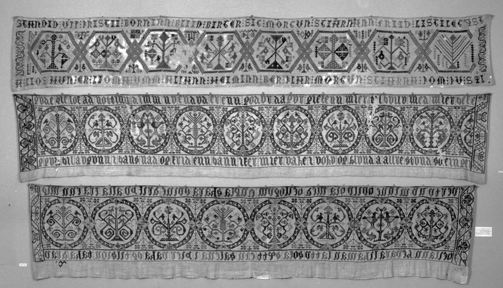 Rekkjurefill með marglitum ísaum á hvítt hörlérept: á honum eru 8 sexhyrníngar tengdir saman með smærri ferhyrníngum: innan í öllum sexhyrníngunum eru sýnd tré, sem tvær dúfur sitja á og snúa flestar saman nefjum, eins eru víðast á milli sexhyrnínganna að neðan tvær dúfur, sem báðar halda með nefinu í sama blóm. Þetta er mjög skáldlegt, því dúfan er ástar og saklsysis einkenni, og tréð og blómið, sem hér er sýnt, mun eiga að tákna lífstré eða lífsblóm, sem báðar dúfurnar njóta sameiginlega. Þetta bendir á, að refillinn sé ætlaður um hjónarúm, að ofan og neðan er saumað með bandaletri: „standið, upp, Kristii, börnin, bliið, birter, sig, morgun, stiarnann, friið, listileg, ástar, liós, hvn, er, lioma, vmm, allann, heiminn, ber, Klár, morgvn, stiarna, kom, þú, sæl,.“ Á endanum er laufaviður með þremur blöðum í hverjum bug, líkustum smáralaufum, Nr. 160 og 161 er líka með 9 og 8 hríngum og rósum eða trjám innan í með dúfum: það fyrra hefir þriggja þuml. breiðan bekk ósaumaðan að neðan, en það síðara 6 þuml., en Nr. 615 og Nr. 337 hefir ekkert ósaumað að neðan. Til hvers sá bekkur hafi verið hafður, er óvíst, allrahelzt vegna þess, að hann er líka hafður á kirkjureflunum. Varla gátu neðri tjöldin hafa gengið að utanverðu upp á reflana, því þá yrðu að sjást göt í þá neðanverða fyrir tjaldsnaglana, enda munu neðri tjöldin ætið hafa gengið upp undir reflana, eins og altarisklæðin jafnan gánga upp undir altarisbrúnirnar, og hafa þau því tíðum ósaumaðan bekk að ofan, eins og Nr. 404: eg held því, að þessi bekkur hafi einúngis verið hafður til skilmerkilegrar aðgreiníngar milli refilsins og tjaldanna eða dúkanna 1), sem voru þar fyrir neðan, hvort heldur sem var á veggjum eða rekkjum. 1) orðið tjald hefir almenna merkíng, en aptur á móti eru orðin: reflar, borðar, brúnir og dúkar einskorðaðrar merkíngar, sjá Nr. 405.