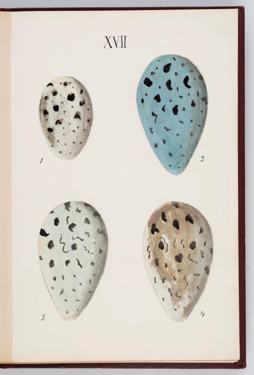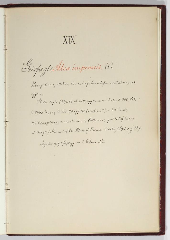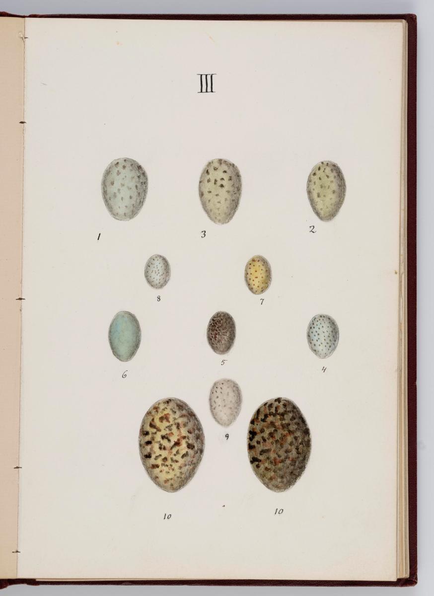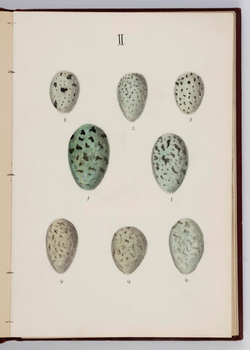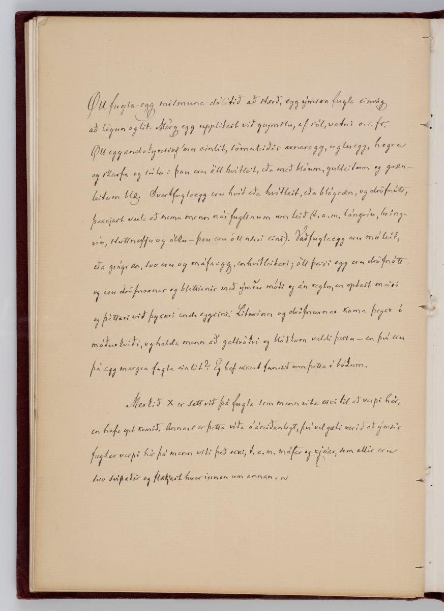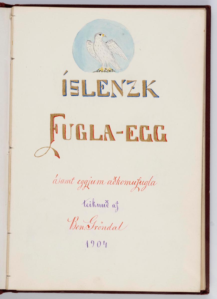 Bók, Íslenzk fugla-egg, ásamt eggjum aðkomufugla, teiknuð af Ben. Gröndal 1904, svo á titilblaðinu, sem er skrautritað. Á næsta blaði stendur, sömuleiðis skrautritað: Til Guðmundar Magnússonar Læknaskólakennara 25. September 1904 frá B.G. Á því blaði eru einnig skrautlegar litmyndir af fugli, þrílitri fjólu, rós og laxveiðimanni. Í bókinni eru 20 myndablöð með litmyndum af eggjunum og eru þær með eðlilegri stærð, en fyrir framan hvert blað er annað með skrá yfir fugla þá sem eggin eiga: eru fuglaheitin á íslenzku og latínu (með rauðu letri), þess getið, hve mörg egg hver fugl eigi og hve lengi hann sje að unga út: enn fremur eru þar athugasemdir um sjaldséða fugla hjer. Aptst er blað með ýmsum athugasemdum um bókina og um lit fuglaeggja. Bókin er bundin inn í rauðbrúnt ljerept. St. 25,5 x 17,8: þ. 1,3.