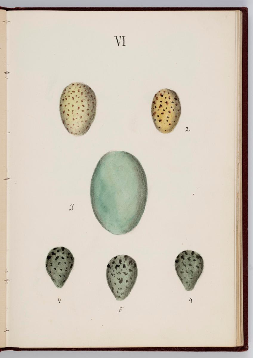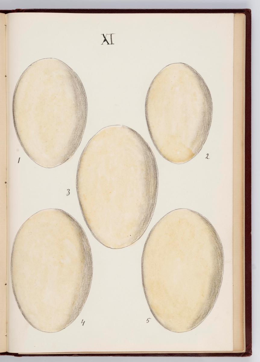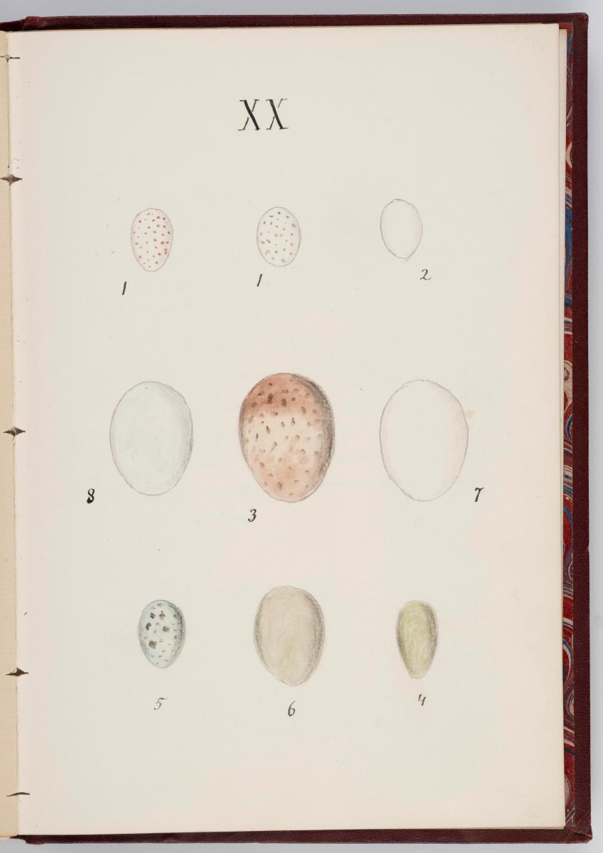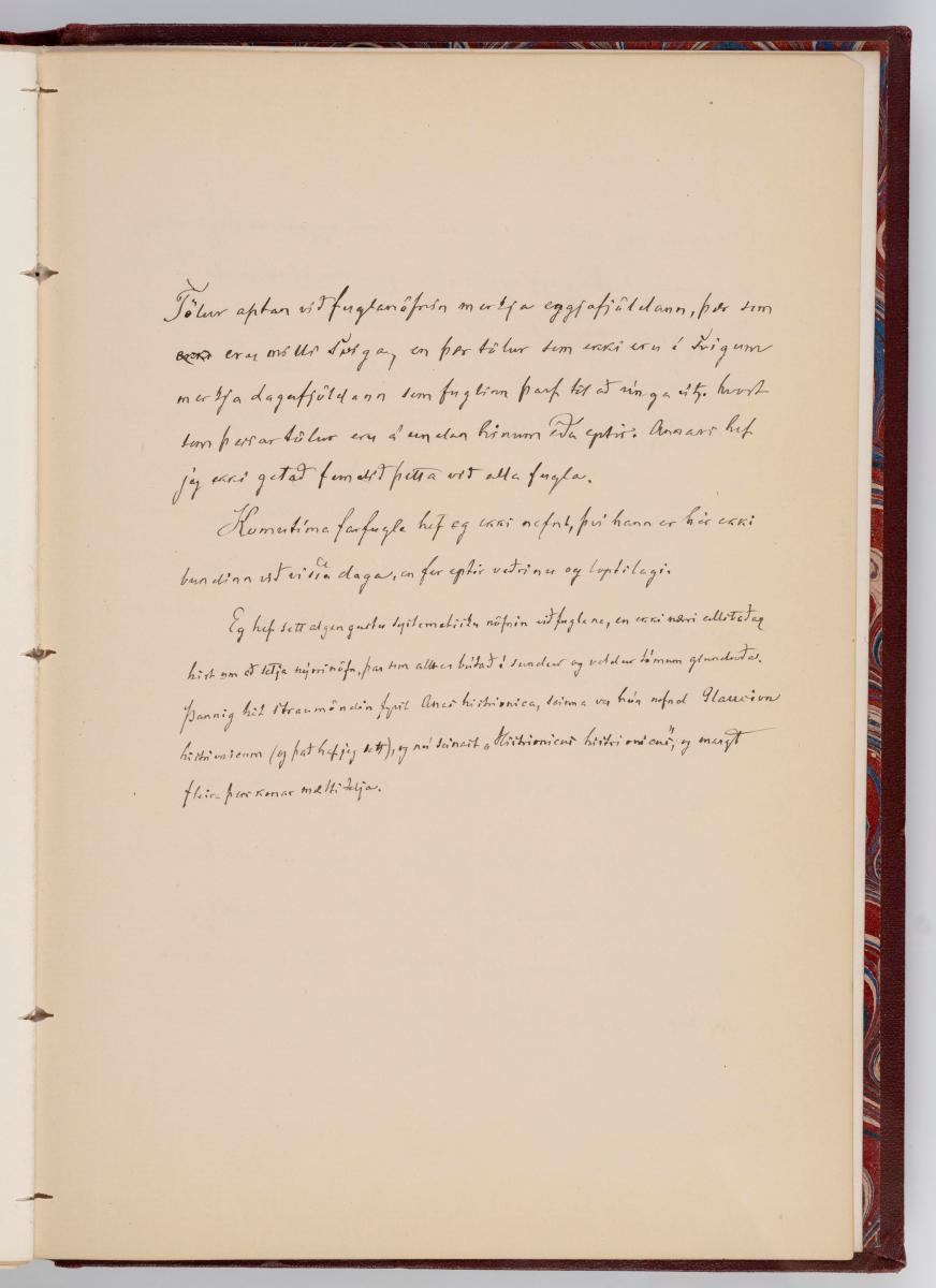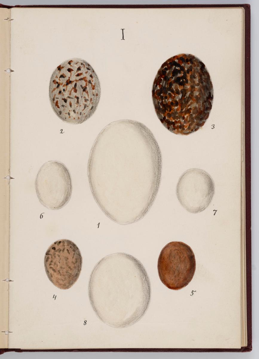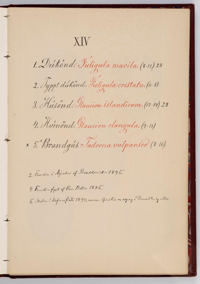 Bók, Íslenzk fugla-egg, ásamt eggjum aðkomufugla, teiknuð af Ben. Gröndal 1904, svo á titilblaðinu, sem er skrautritað. Á næsta blaði stendur, sömuleiðis skrautritað: Til Guðmundar Magnússonar Læknaskólakennara 25. September 1904 frá B.G. Á því blaði eru einnig skrautlegar litmyndir af fugli, þrílitri fjólu, rós og laxveiðimanni. Í bókinni eru 20 myndablöð með litmyndum af eggjunum og eru þær með eðlilegri stærð, en fyrir framan hvert blað er annað með skrá yfir fugla þá sem eggin eiga: eru fuglaheitin á íslenzku og latínu (með rauðu letri), þess getið, hve mörg egg hver fugl eigi og hve lengi hann sje að unga út: enn fremur eru þar athugasemdir um sjaldséða fugla hjer. Aptst er blað með ýmsum athugasemdum um bókina og um lit fuglaeggja. Bókin er bundin inn í rauðbrúnt ljerept. St. 25,5 x 17,8: þ. 1,3.