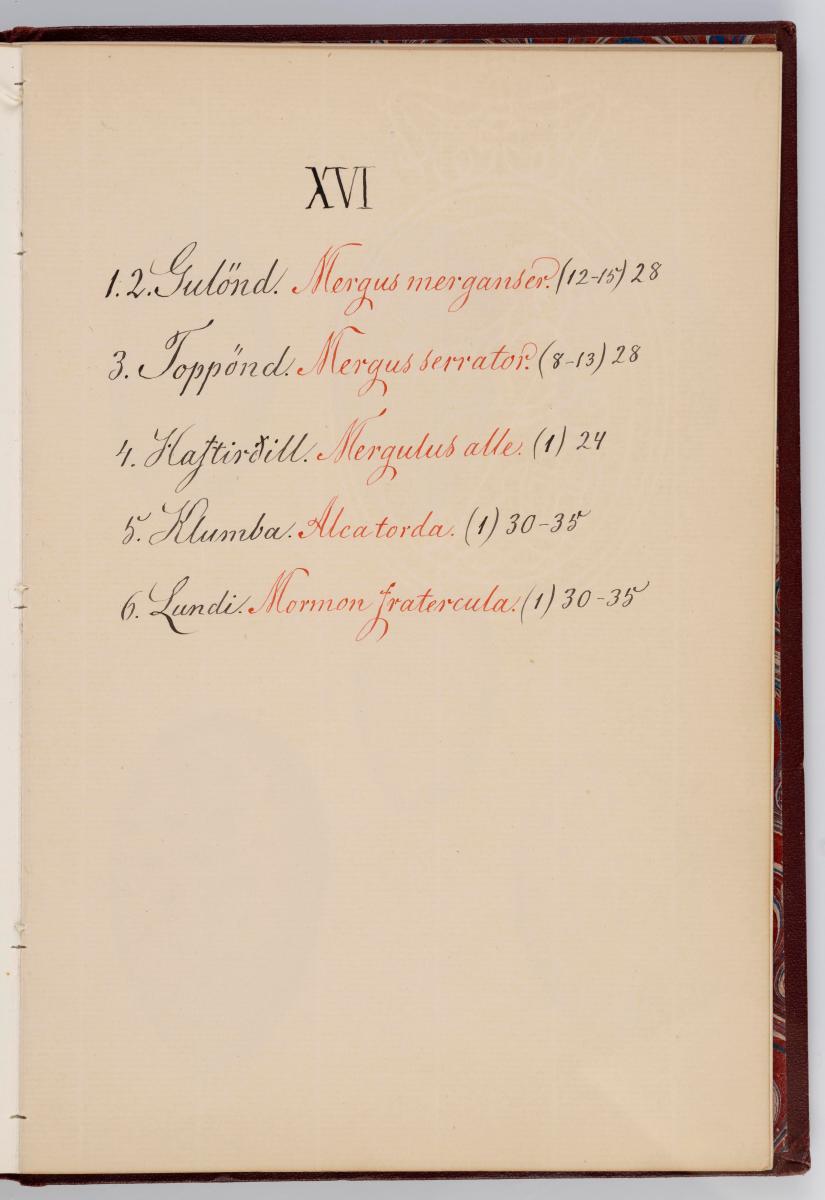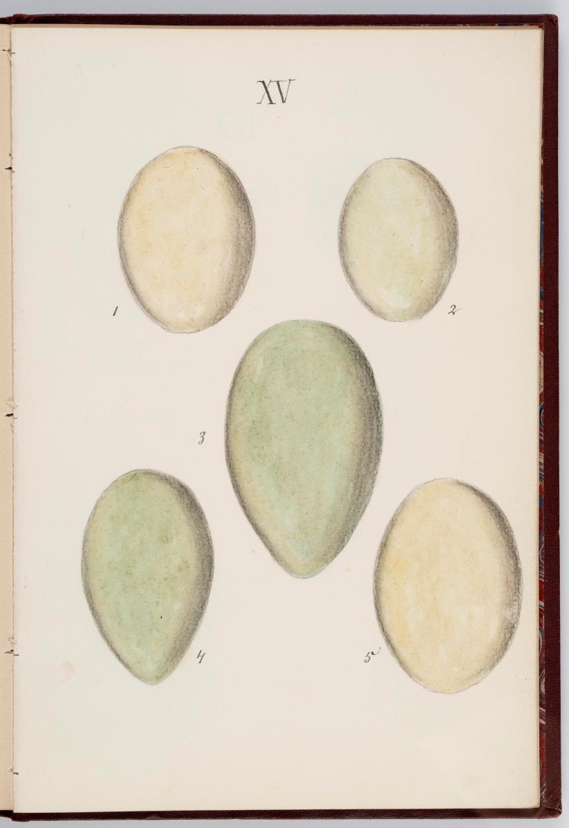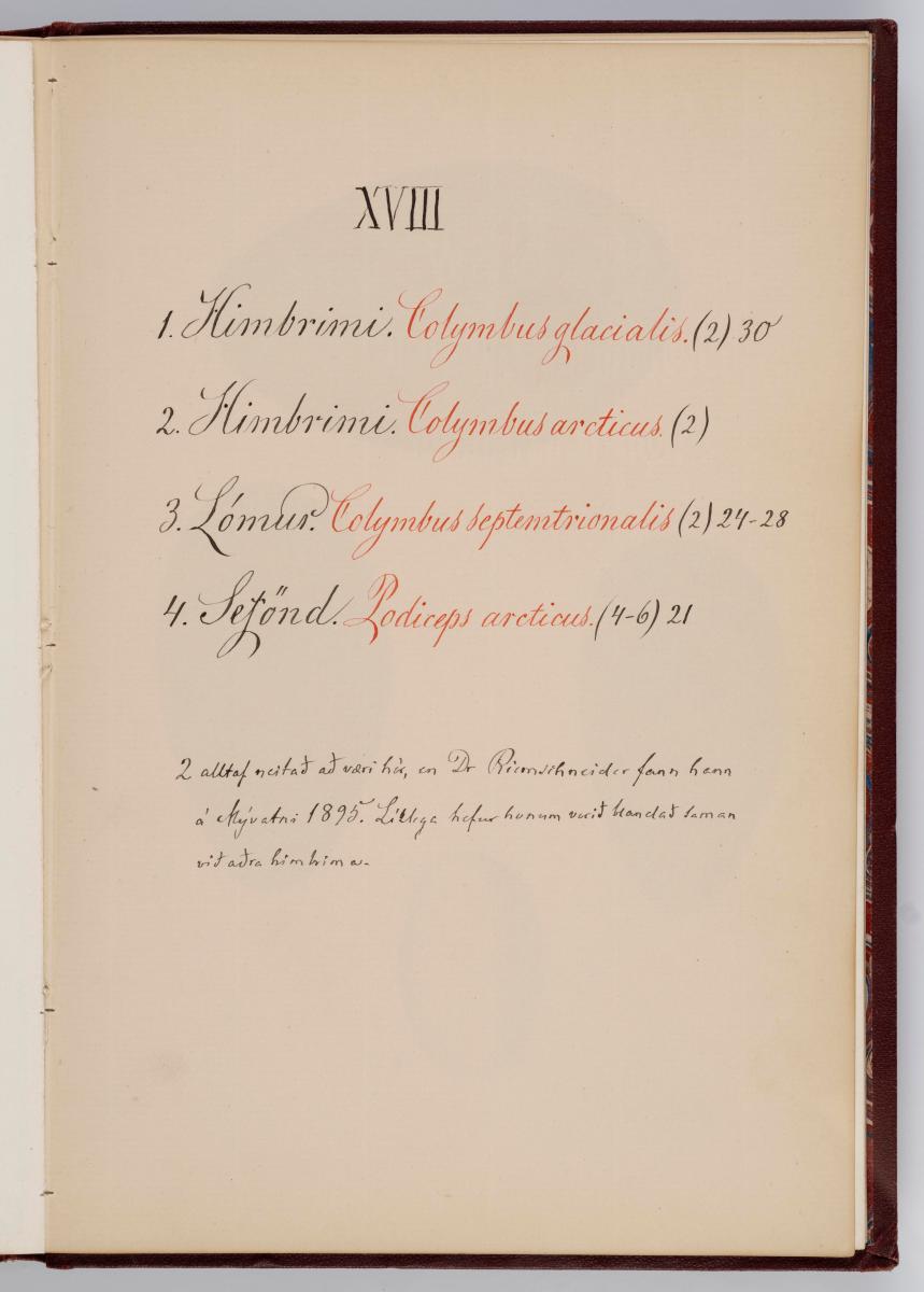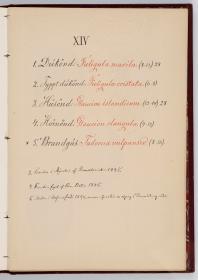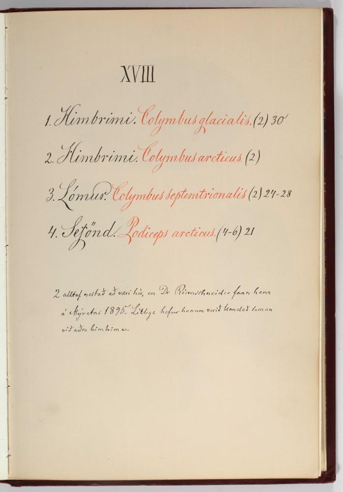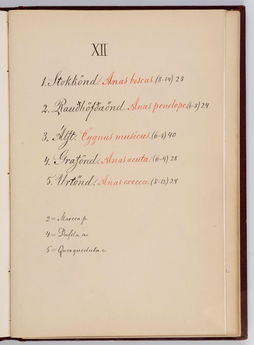 Bók, Íslenzk fugla-egg, ásamt eggjum aðkomufugla, teiknuð af Ben. Gröndal 1904, svo á titilblaðinu, sem er skrautritað. Á næsta blaði stendur, sömuleiðis skrautritað: Til Guðmundar Magnússonar Læknaskólakennara 25. September 1904 frá B.G. Á því blaði eru einnig skrautlegar litmyndir af fugli, þrílitri fjólu, rós og laxveiðimanni. Í bókinni eru 20 myndablöð með litmyndum af eggjunum og eru þær með eðlilegri stærð, en fyrir framan hvert blað er annað með skrá yfir fugla þá sem eggin eiga: eru fuglaheitin á íslenzku og latínu (með rauðu letri), þess getið, hve mörg egg hver fugl eigi og hve lengi hann sje að unga út: enn fremur eru þar athugasemdir um sjaldséða fugla hjer. Aptst er blað með ýmsum athugasemdum um bókina og um lit fuglaeggja. Bókin er bundin inn í rauðbrúnt ljerept. St. 25,5 x 17,8: þ. 1,3.